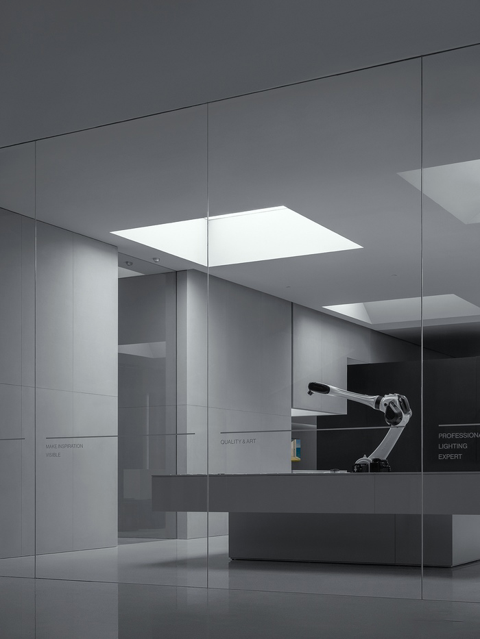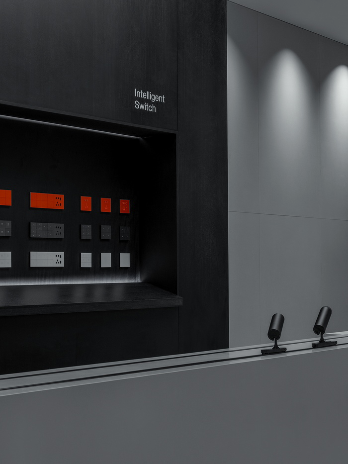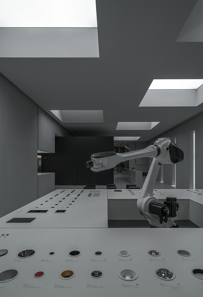 In this space, we have a lamp display table, on which various lamps are displayed. Through the buttons, visitors can actually operate the switches of the lamps, so as to better understand the design and function of the lamps. At the center of the display table is a robotic arm programmed to demonstrate the disassembly and assembly process of the lamp parts. The movement of this robotic arm is designed to resemble human gestures, and it will dance when there are visitors and respond to the indoor lights. This design not only allows people to better understand the design and manufacturing process of the lamps, but also allows visitors to gain a unique artistic experience while admiring the lamps.