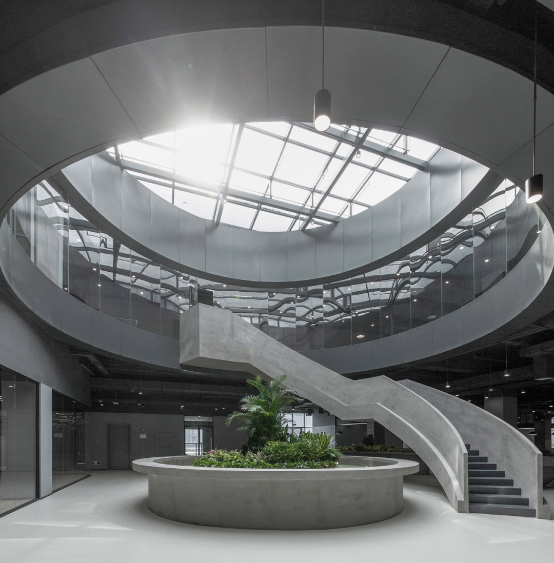 中庭设计独具匠心,通过特殊的楼梯设计和天窗设置,创造出一个充满视觉张力和自然光线的空间,为员工提供了一个独特的休闲区域。