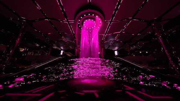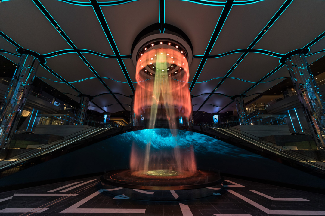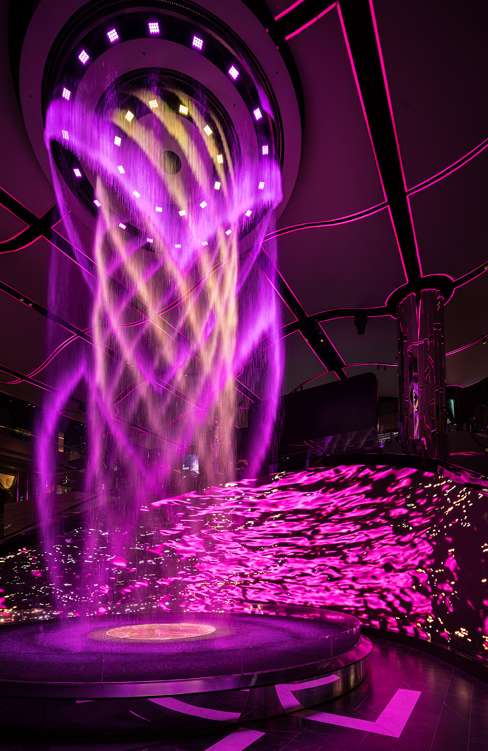 13米高的圆柱形装置通过编程呈现不同形态的瀑布,将变化的光线图像延伸到天花板、墙壁和空间中的水景中,为整个空间注入了优雅和动感。这个装置还将根据一天中的时间变化呈现不同的环境、场景和互动内容。