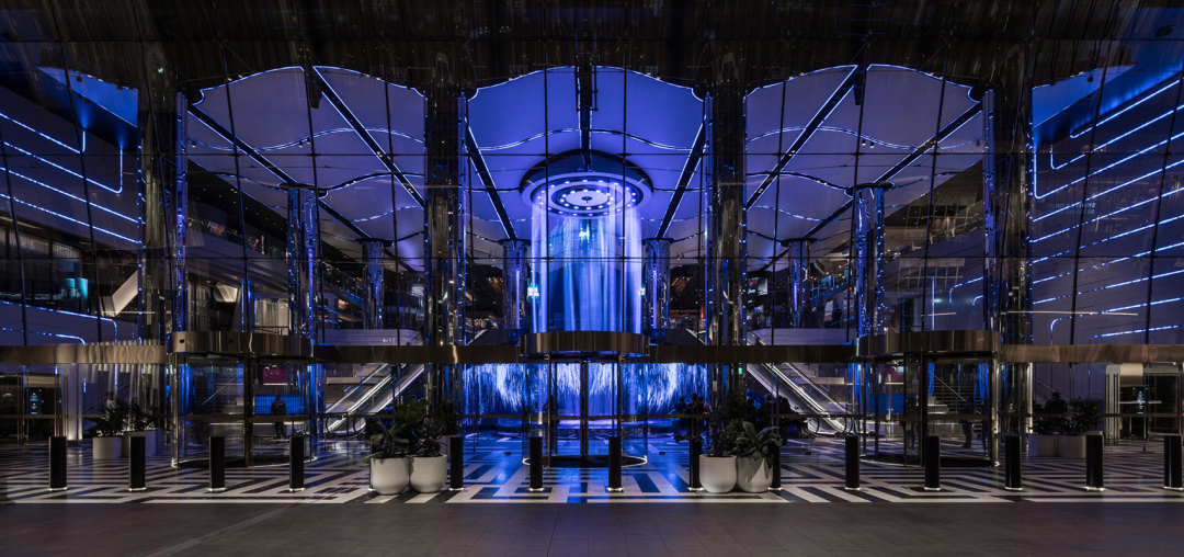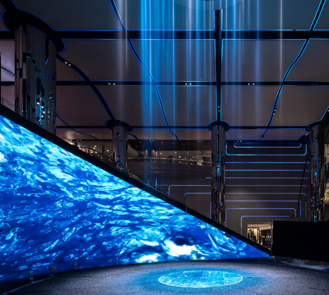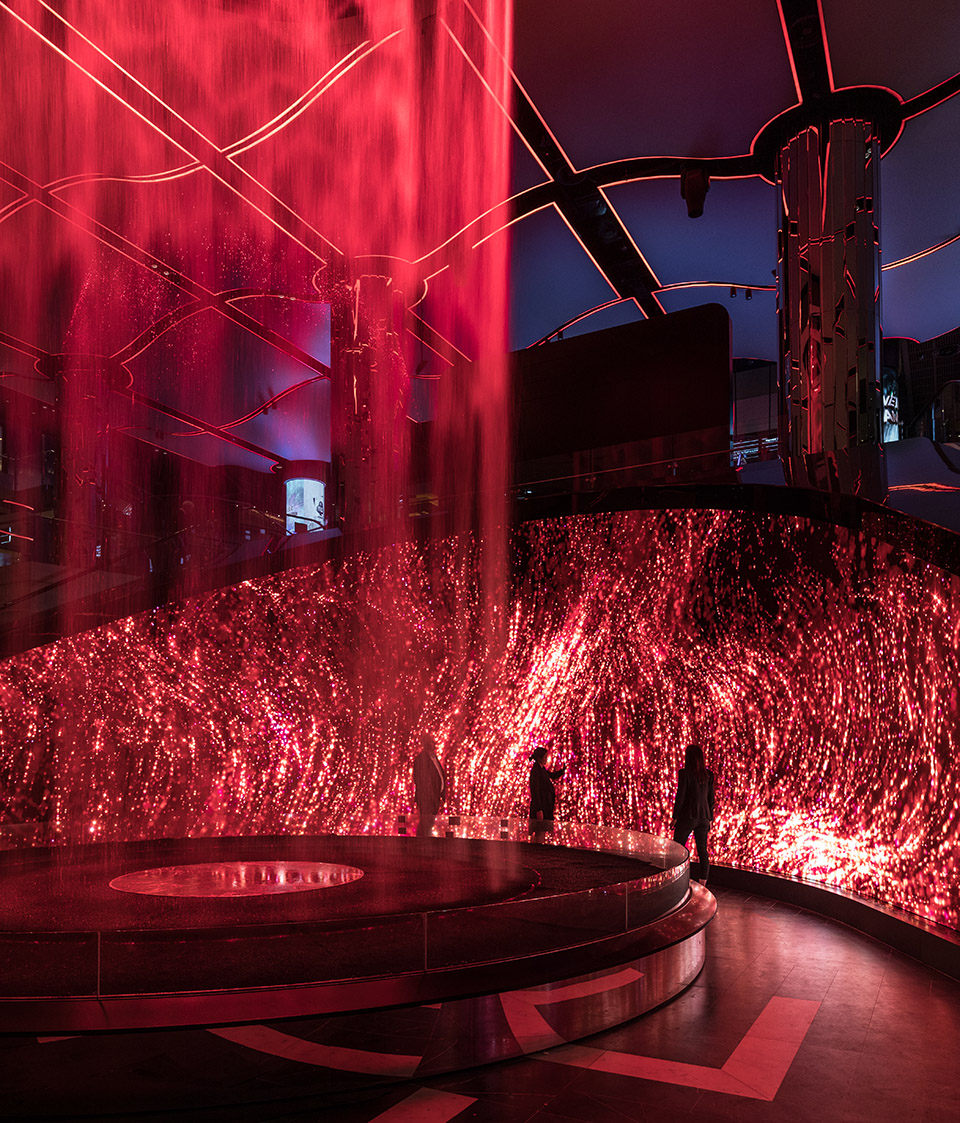 The 13 meter tall cylindrical device presents different forms of waterfalls through programming, extending the changing light images to the ceiling, walls, and water features in the space, injecting elegance and dynamism into the entire space. This device will also present different environments, scenes, and interactive content based on changes in time throughout the day.