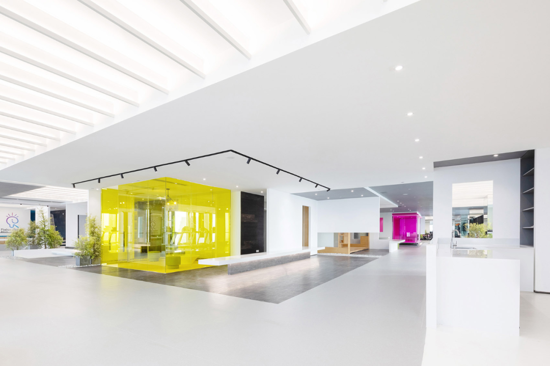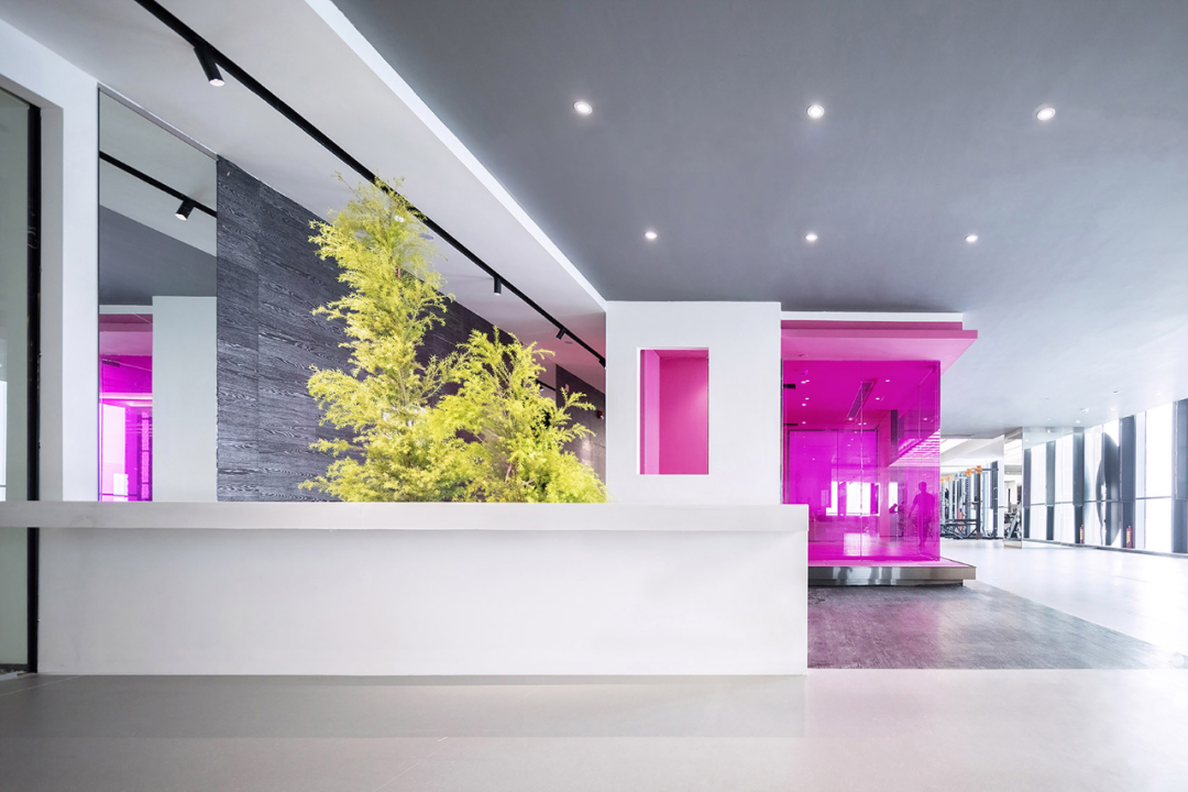 In terms of design, Poly Ruisi Workshop attempts to implant new brand space installations and create a flowing and inclusive social space by reshaping the standard floor space. This device extends from the inside out along the core tube, sometimes folding into the ground, sometimes tearing open into walls, sometimes turning into furniture, sometimes opening into windows, forming a unique brand space container. The interior of this container is defined as the city living room, where people can converse, gather, wait, and meet through a series of different social postures. During the day, the device becomes a filter for external light, while at night, it creates a psychedelic spatial effect with the addition of internal reflective lights and external city lights.