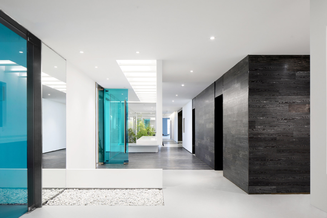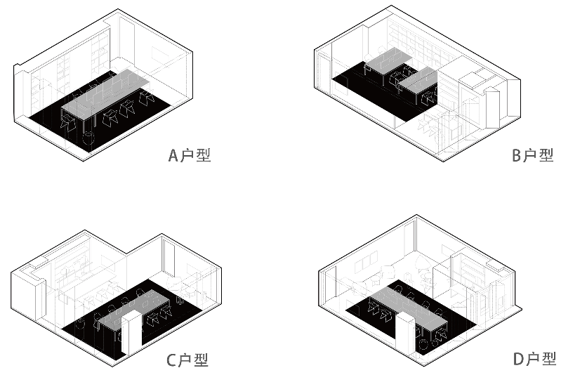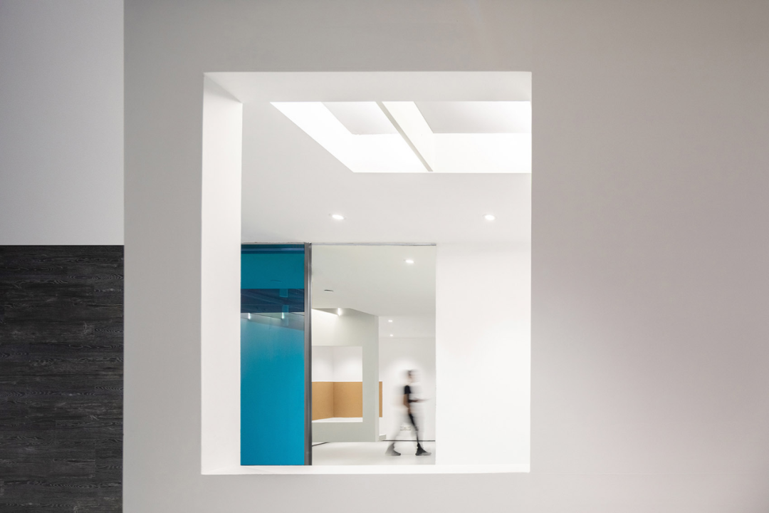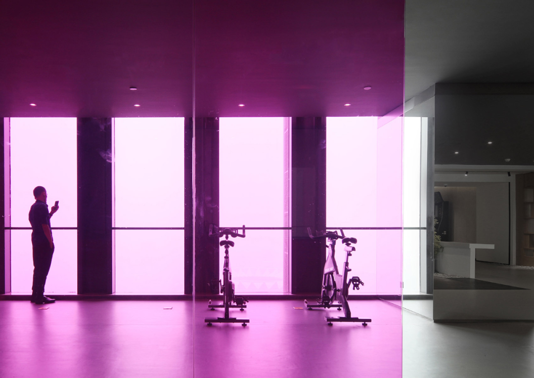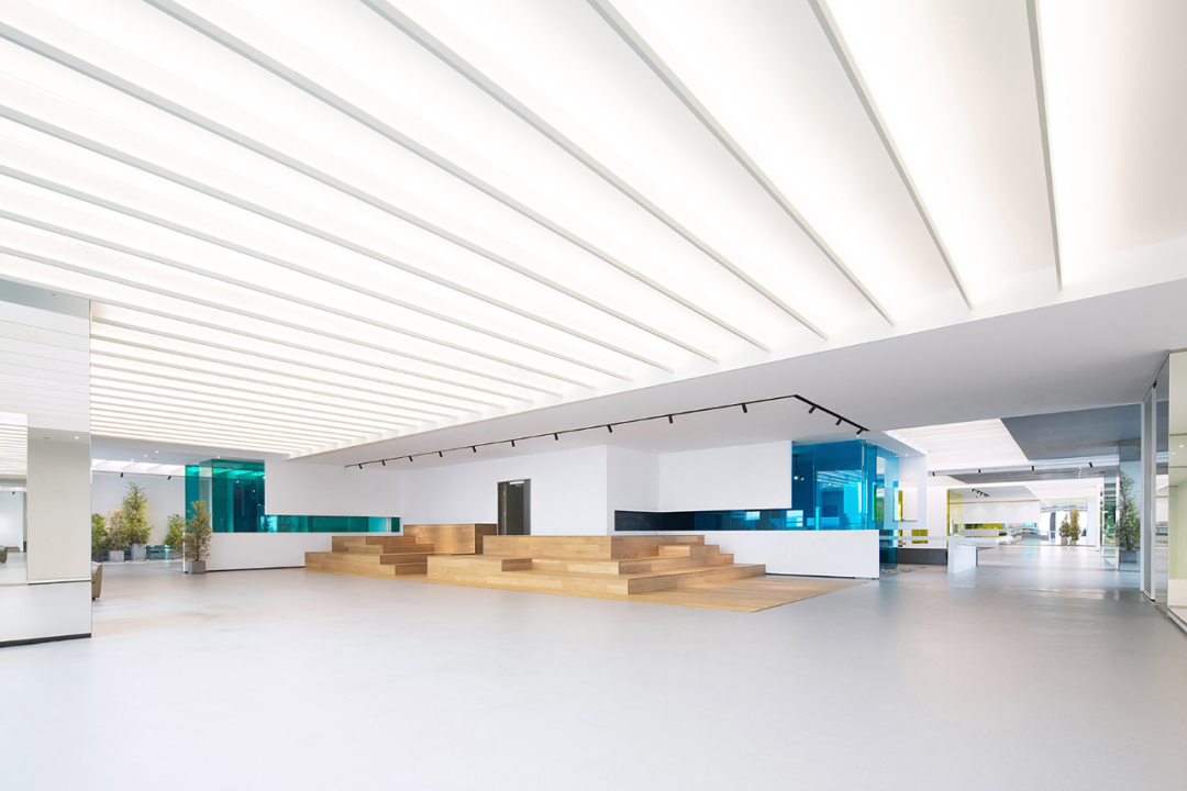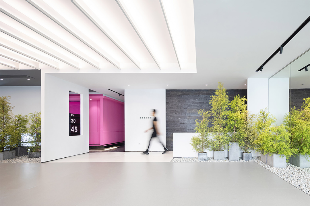 设计上,保利睿思工坊试图植入新的品牌空间装置体,并通过重塑标准层空间,创造出一个流动的、包容的社交场所。这个装置体沿着核心筒由内向外延展,时翻折成地面,时撕开成墙体,时转折成家具,时开洞成窗口,形成一个独特的品牌空间容器。这个容器内部被定义为城市客厅,通过一系列不同的社交姿态,人们可以在这里交谈、聚会、等待和邂逅。白天,装置体成为外部光线的过滤器,夜晚则随着内部反光灯光和外部城市灯光的叠加,创造出迷幻的空间效果。