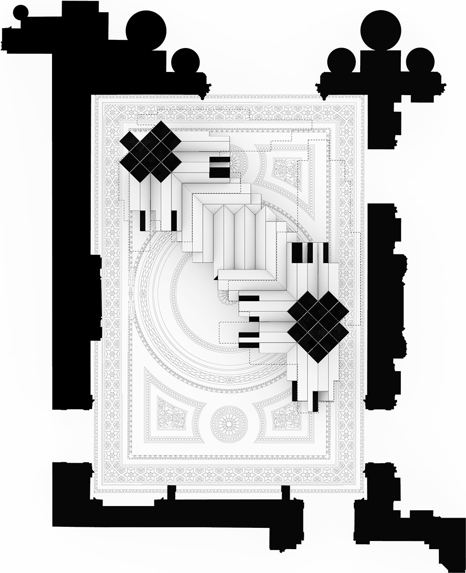 The digital model of the device is projected into the display space through a holographic lens, displaying the positions and connection nodes of modules similar to LEGO blocks. These modules are modular and can be flexibly placed in any position, with adaptability and interactivity with construction. The installation presents unfinished architectural fragments, allowing visitors to experience the feeling of living in this unrealized large building.