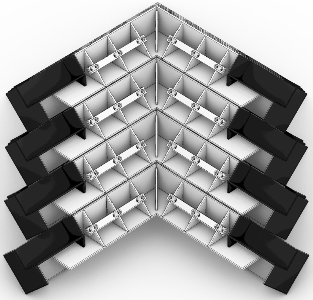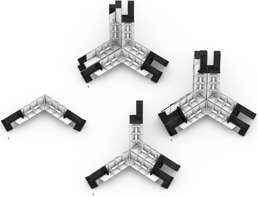 Each plywood construction module is assembled from soft plywood boards that have been CNC milled and can be installed in any structural part of the device. These modules are connected together through tension, forming a sufficiently sturdy system.