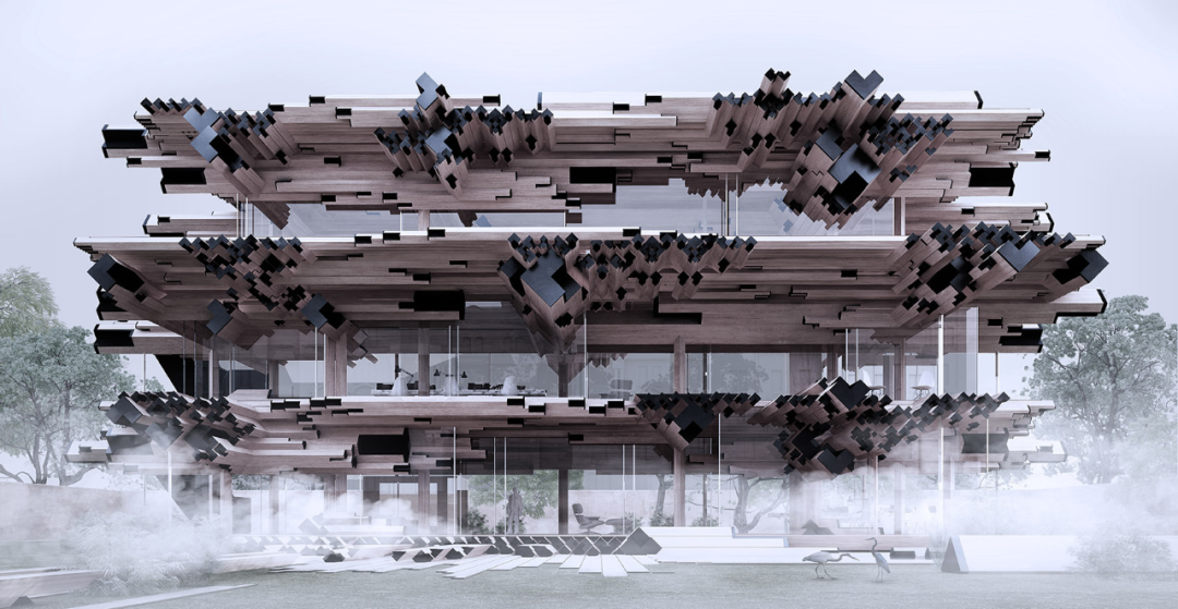 该装置探索了虚拟物体所能够产生的真实效果,展示了木材建筑与自动化和算法相结合所呈现的效果。这种技术的应用已经在其他项目中得到了探索,例如2017年塔林建筑双年展和2015年布鲁塞尔附近Wemmel的多户住宅。