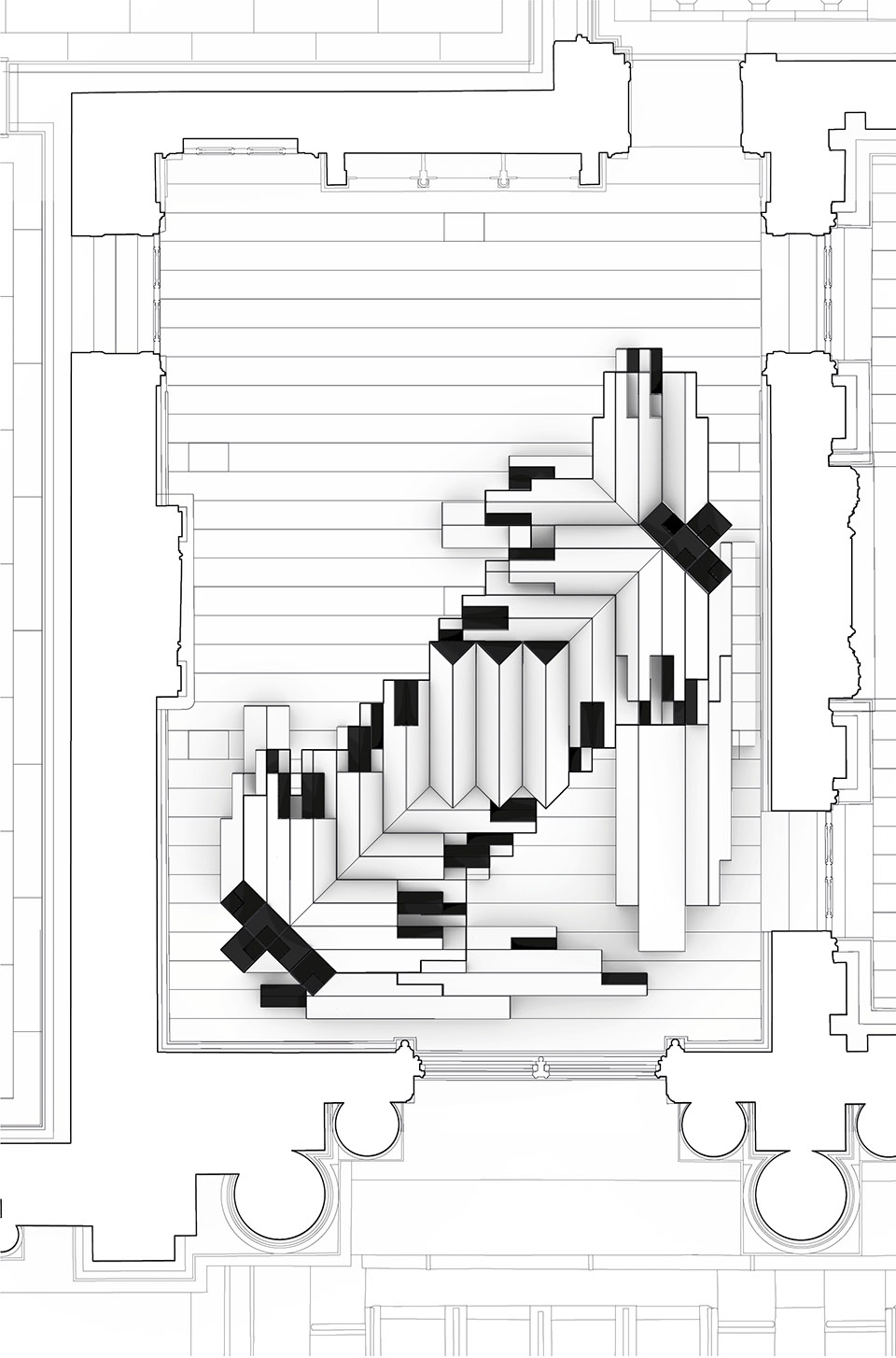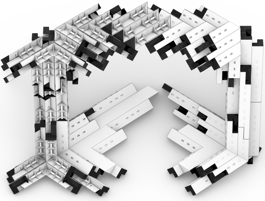该装置的数字模型通过全息透镜投射到展示空间中,显示出类似乐高积木的模块的位置和连接节点。这些模块是模块化的,可以灵活地放置在任何位置,与建造具有适应性和交互性。装置呈现了未完成的建筑片段,让参观者体验在这个未实现的大型建筑中居住的感觉。
