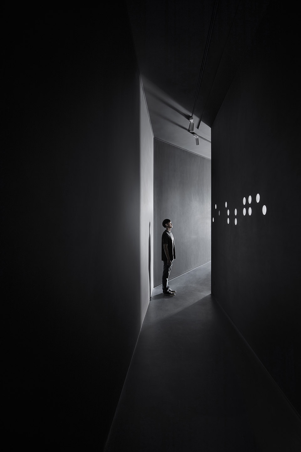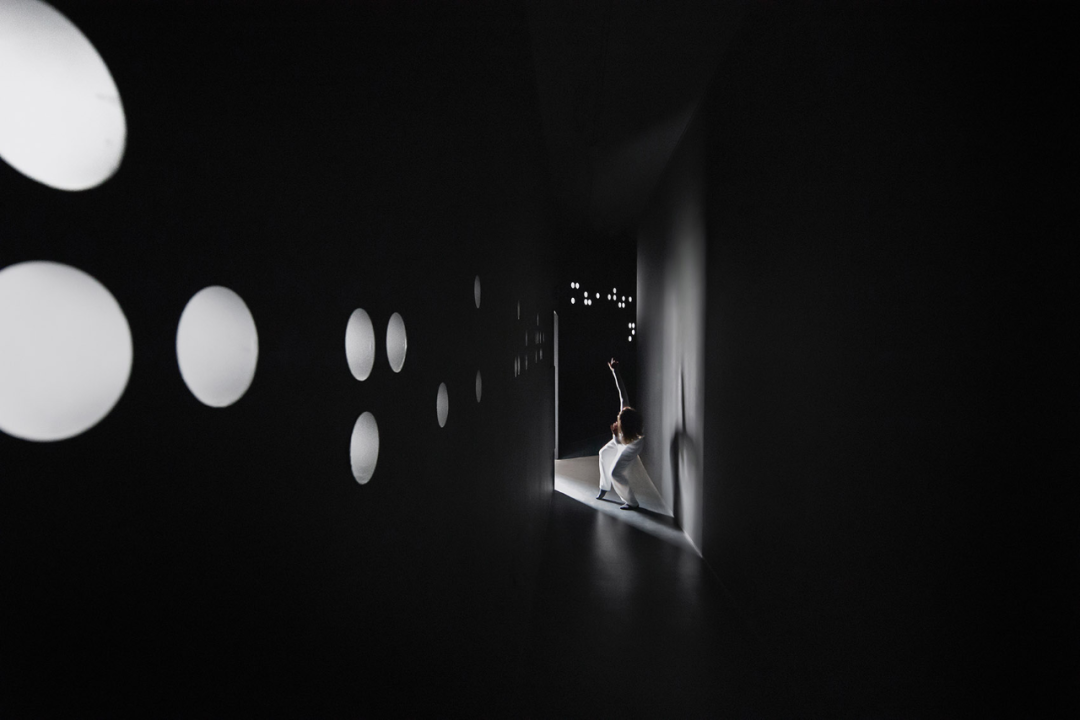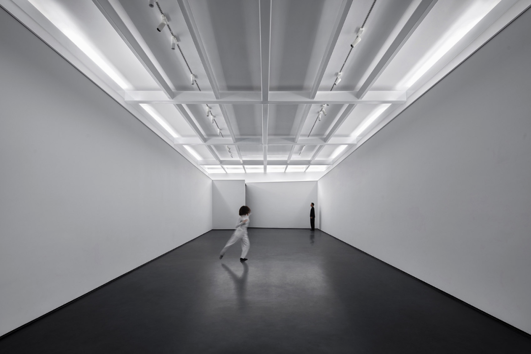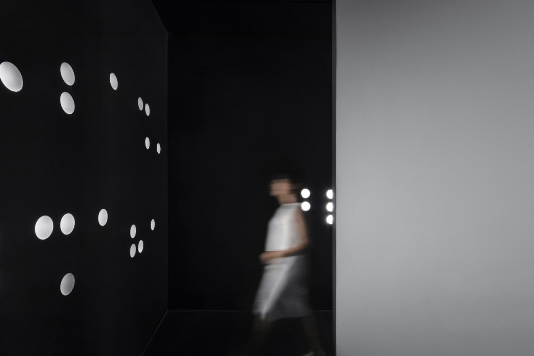 沈少民描述道:“美术馆本身的结构是一个异形的框架,为了增加展线功能,我们在四周做了一个长廊,使展线增加了一倍。同时,这个长廊也形成了一个通往美术馆白色大厅的黑色隧道,也是观众寻找光明的一个过程体验。”