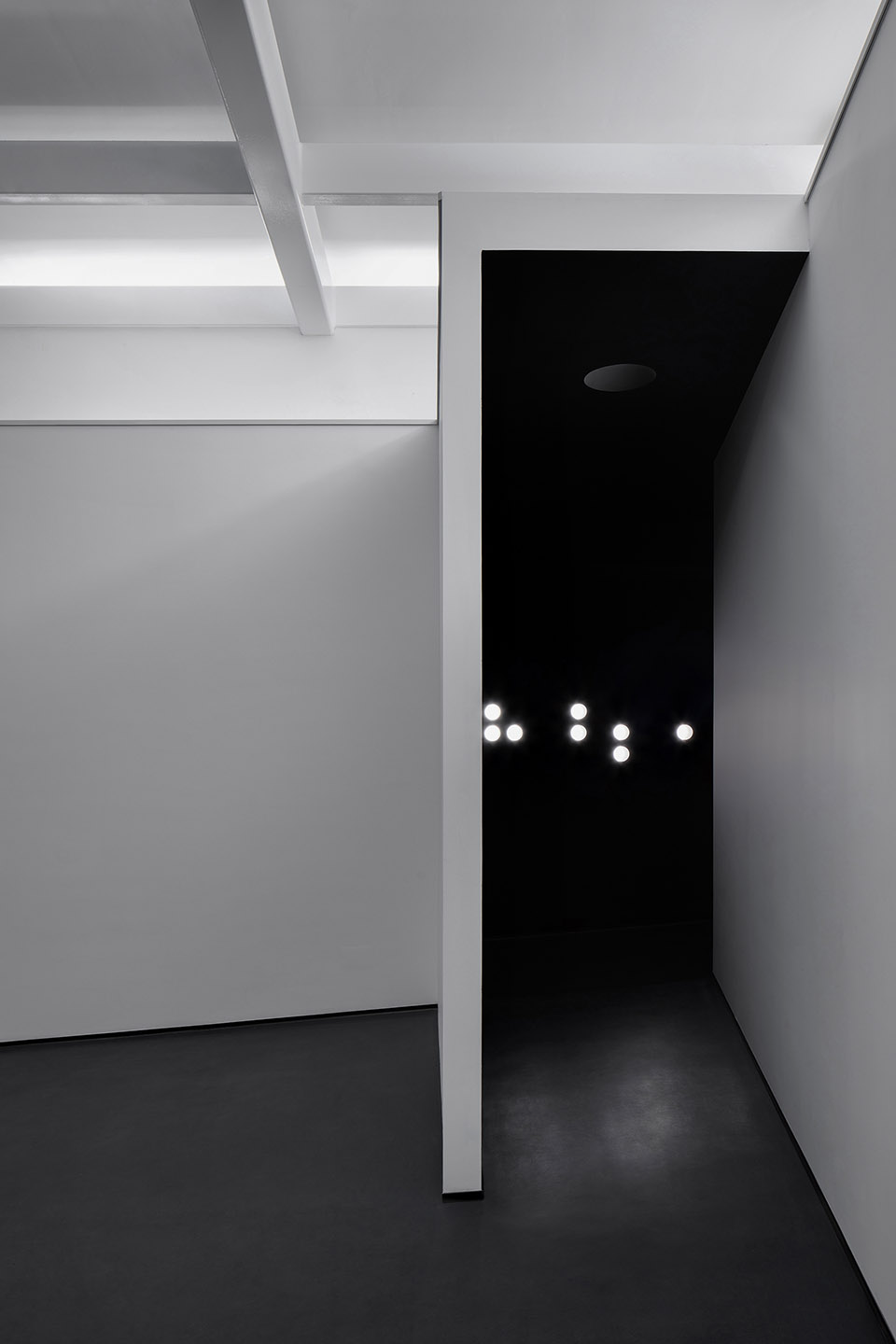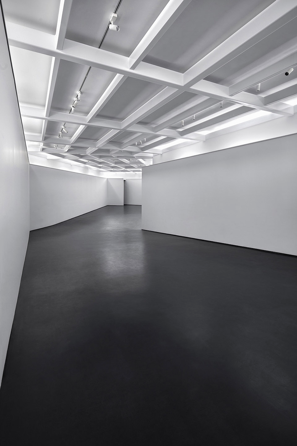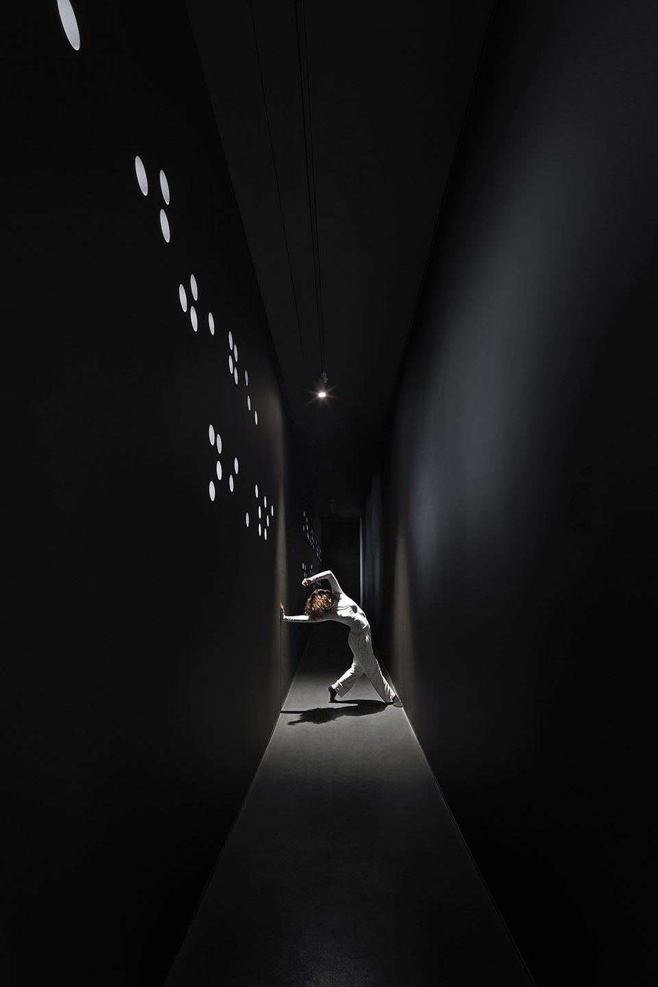 沈少民描述道:“美术馆本身的结构是一个异形的框架,为了增加展线功能,我们在四周做了一个长廊,使展线增加了一倍。同时,这个长廊也形成了一个通往美术馆白色大厅的黑色隧道,也是观众寻找光明的一个过程体验。”