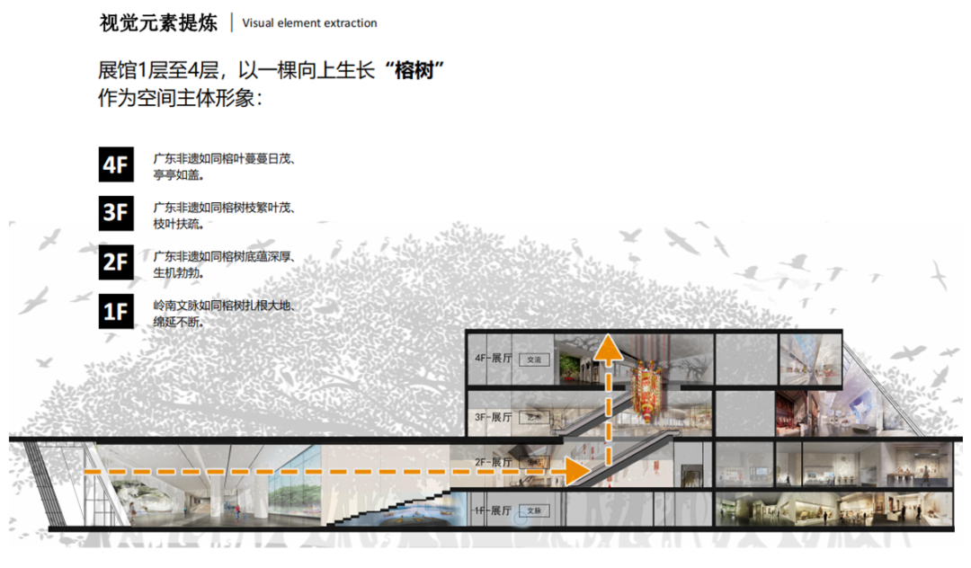 太一团队在深入理解和挖掘广东非遗及广东文化特质的基础上,选取一棵向上生长的“榕树”作为空间主体形象,通过大量艺术创作,在展馆多层面展现“榕树”根脉枝叶,象征广东非遗扎根大地,岭南文脉生生不息。