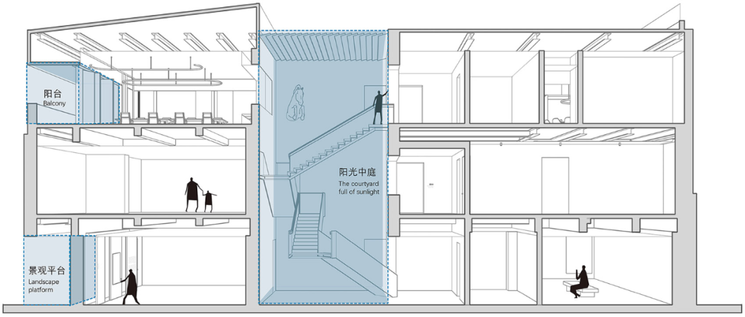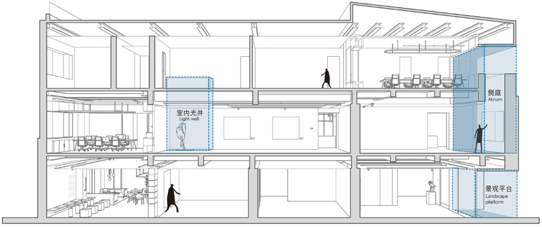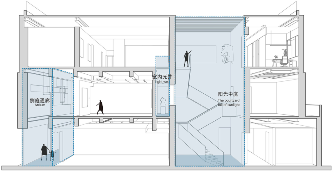 设计师们采用了“减法”的方法来丰富空间层次,实现了空间的重新组合。路易斯·康曾说过,“自然光赋予了空间特性,也赋予了建筑生命。建筑的生命源自于光的照射。”在整个设计过程中,光参与了空间的创造与再组织。设计师们决定保留原有建筑结构的完整性,同时适当减去不同尺度的矩形体量,以形成丰富的空间形式和层次,为光创造了多尺度和多维度的引入空间,使光影与空间产生了无限的可能性。