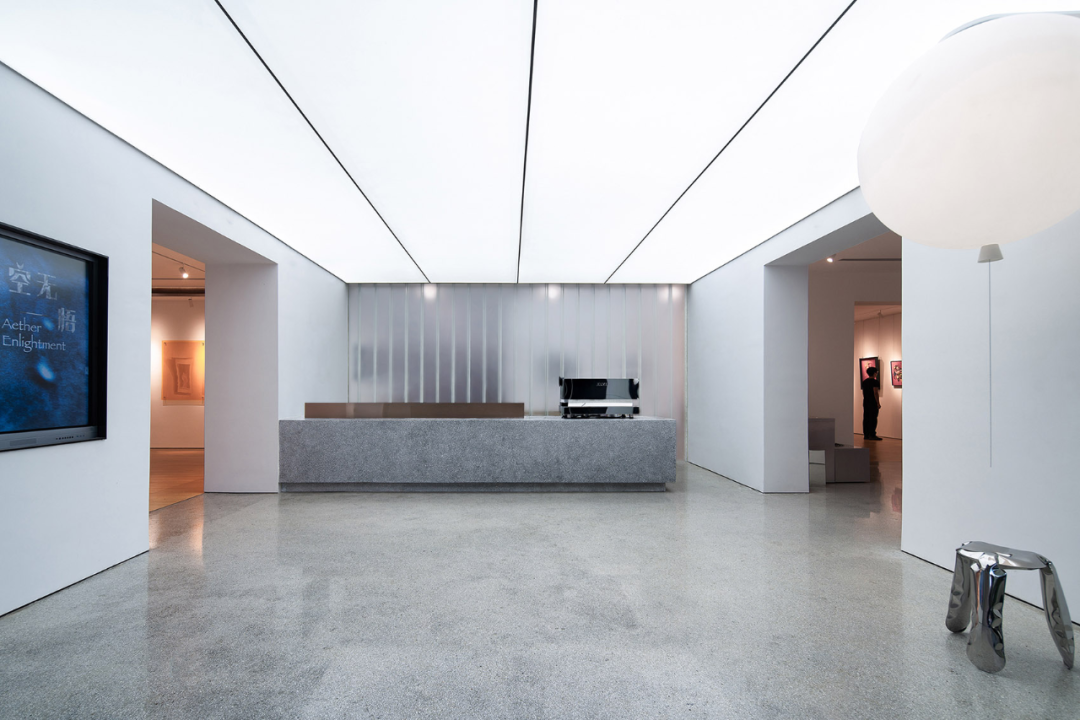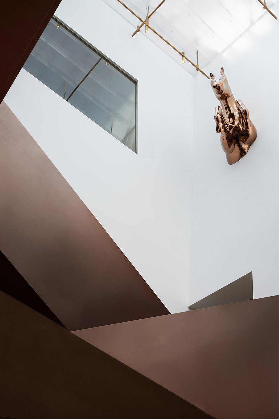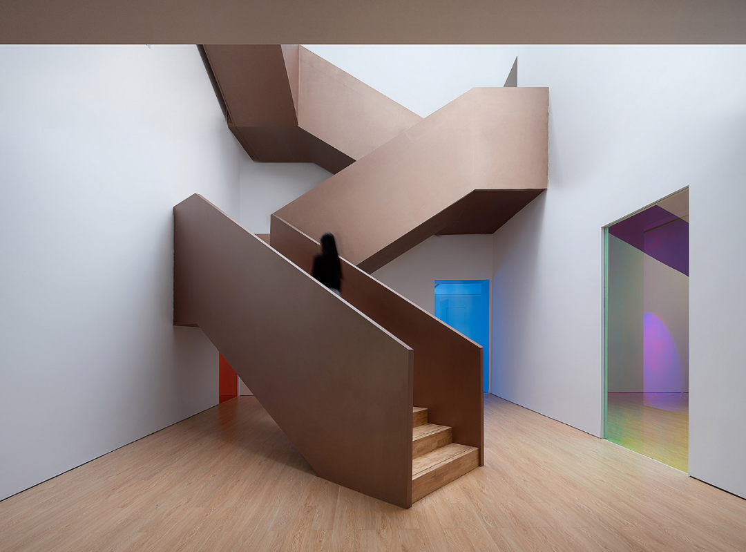 In response to the existing building structure, designers have expanded the original atrium and arranged various functional spaces around it. The U-shaped glass design at the top ensures sufficient natural light introduction. The pedestrian staircase spanning three floors becomes the core of the entire space flow in the art museum, connecting all spaces and also one of the most eye-catching indoor installation arts in the museum.