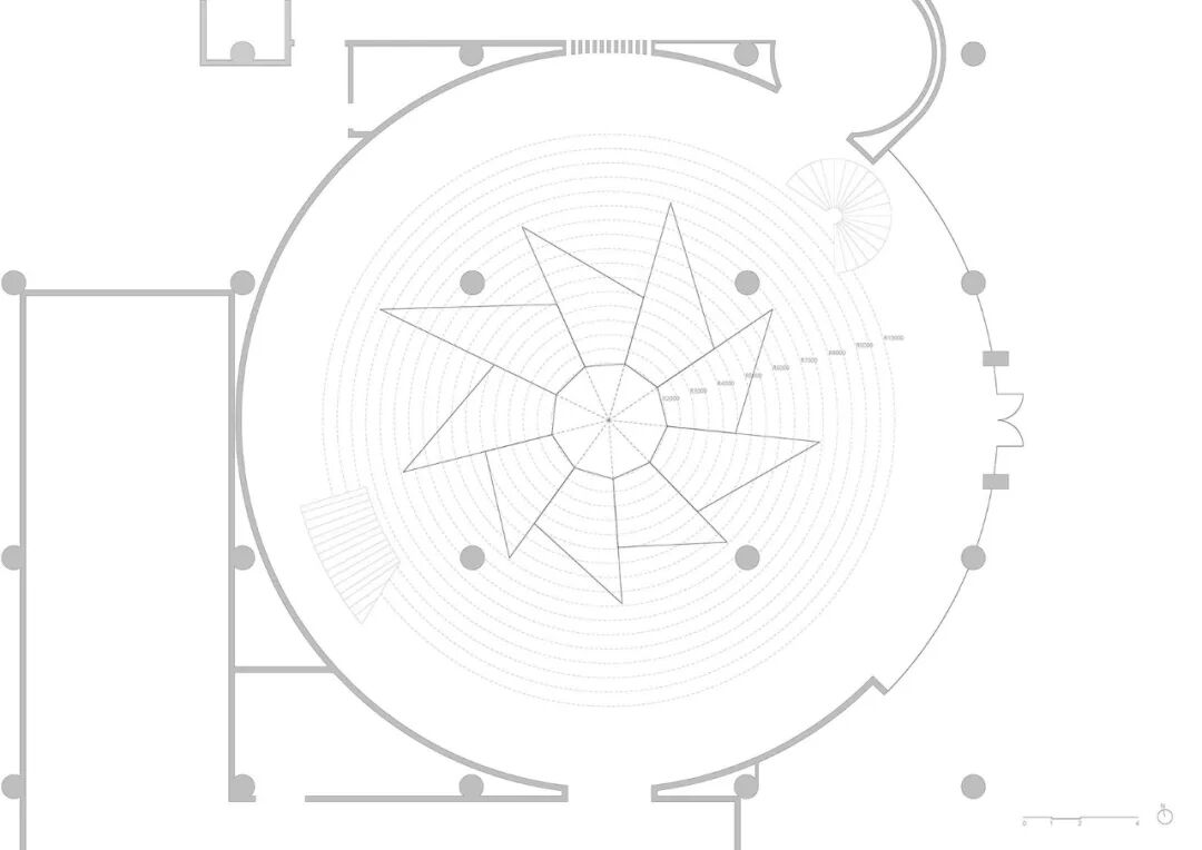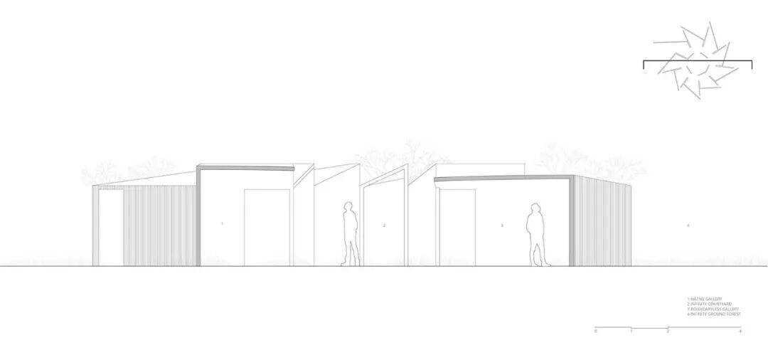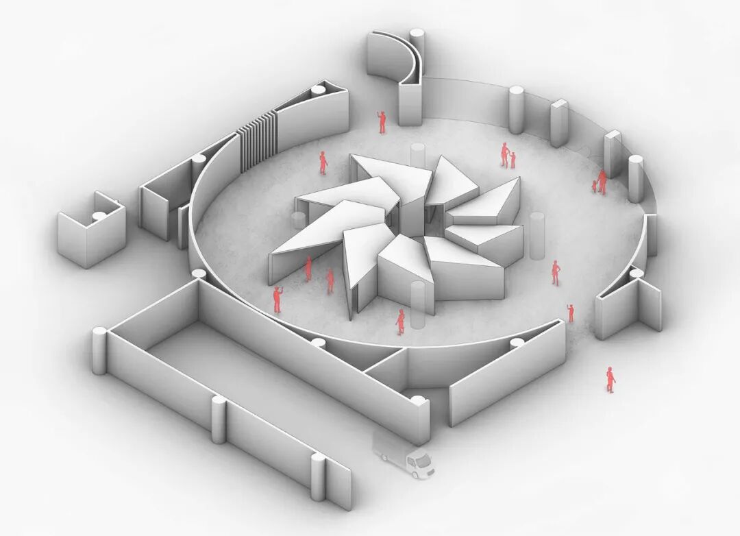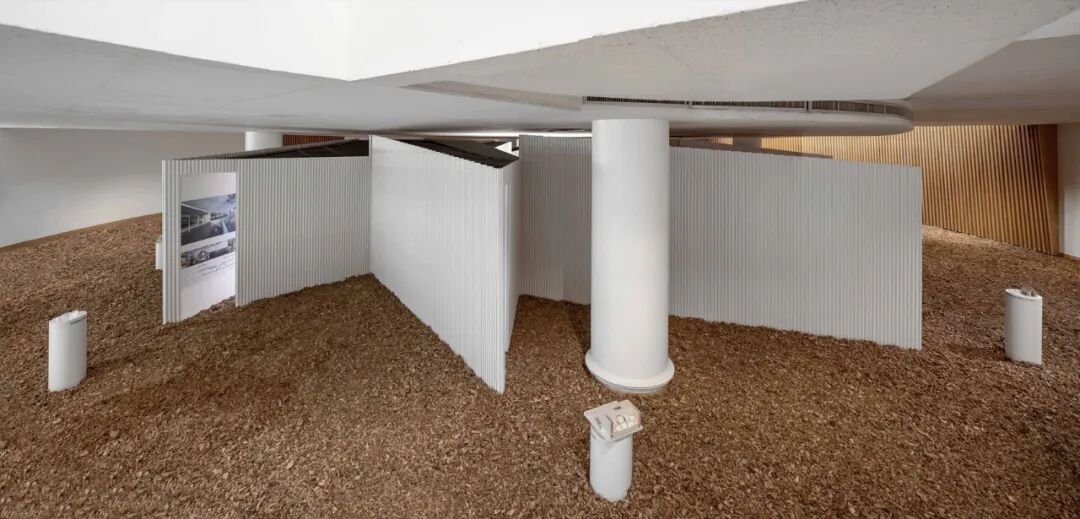 The design of each exhibition space emphasizes the uniqueness of the architectural context. For example, the Coexistence Exhibition Hall records the lifestyle of residents in tropical climates through pixelated graphics, the Ritual Exhibition Hall implies the axis of religious space through bar shaped graphics, and the Regional Exhibition Hall is constructed by vertically stacking display materials. The layout of these eight exhibition halls guides visitors gradually towards the infinite courtyard. Through the mirrored circular chairs, they can vaguely see the sky, ground, buildings, and themselves, presenting the theme of the exhibition of infinite architecture on the earth.