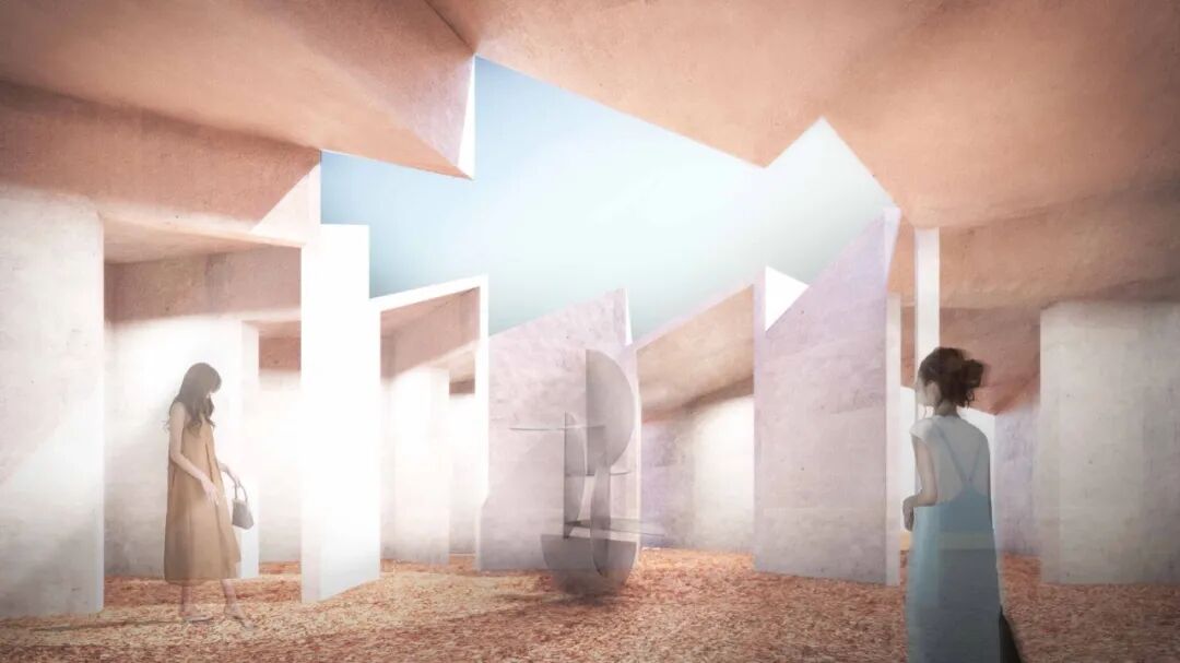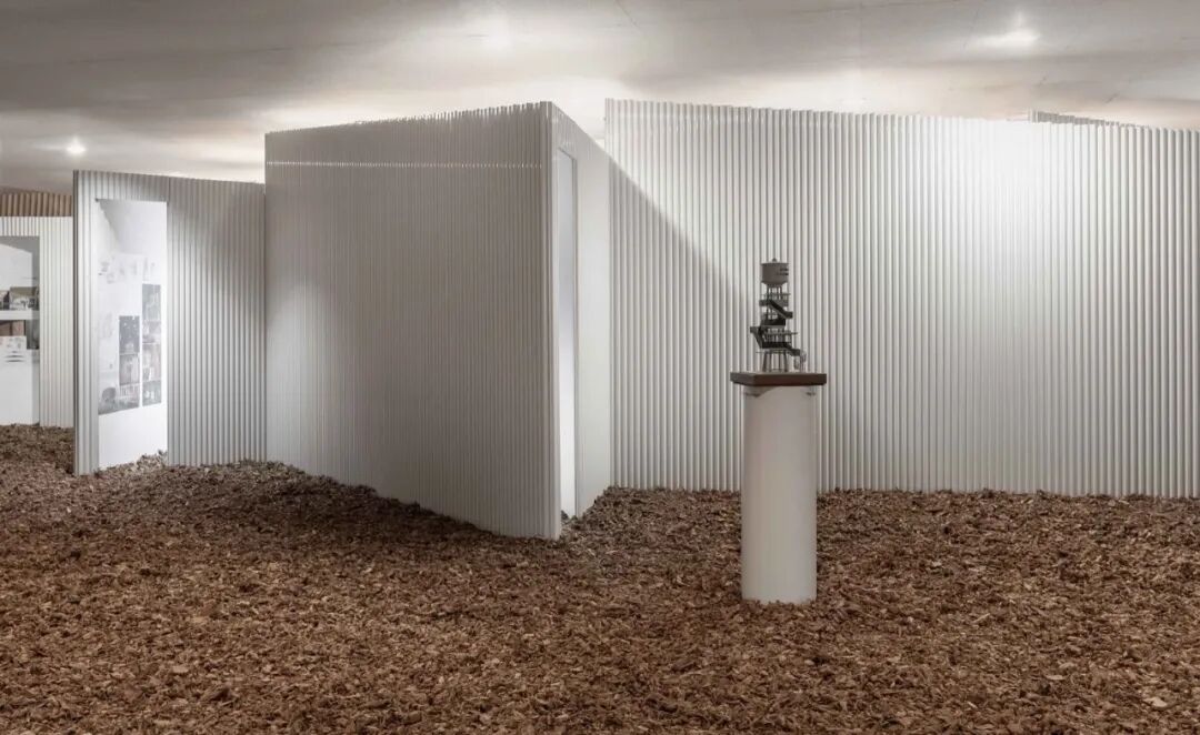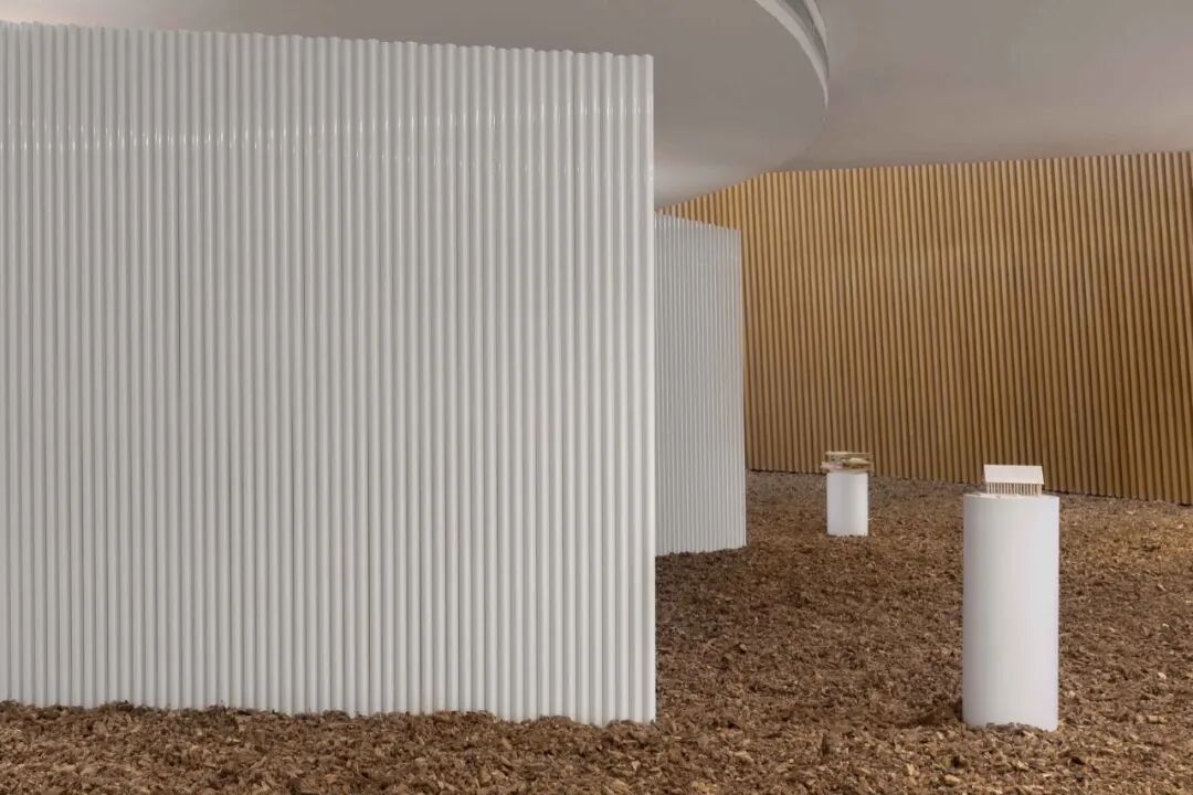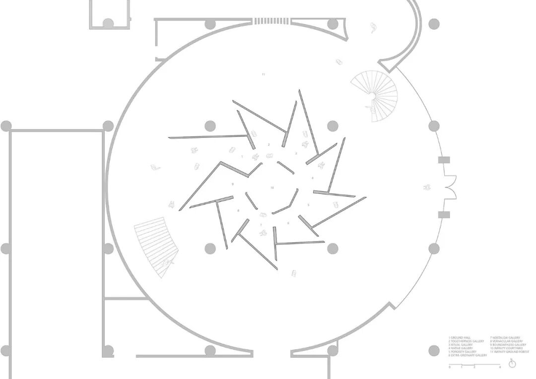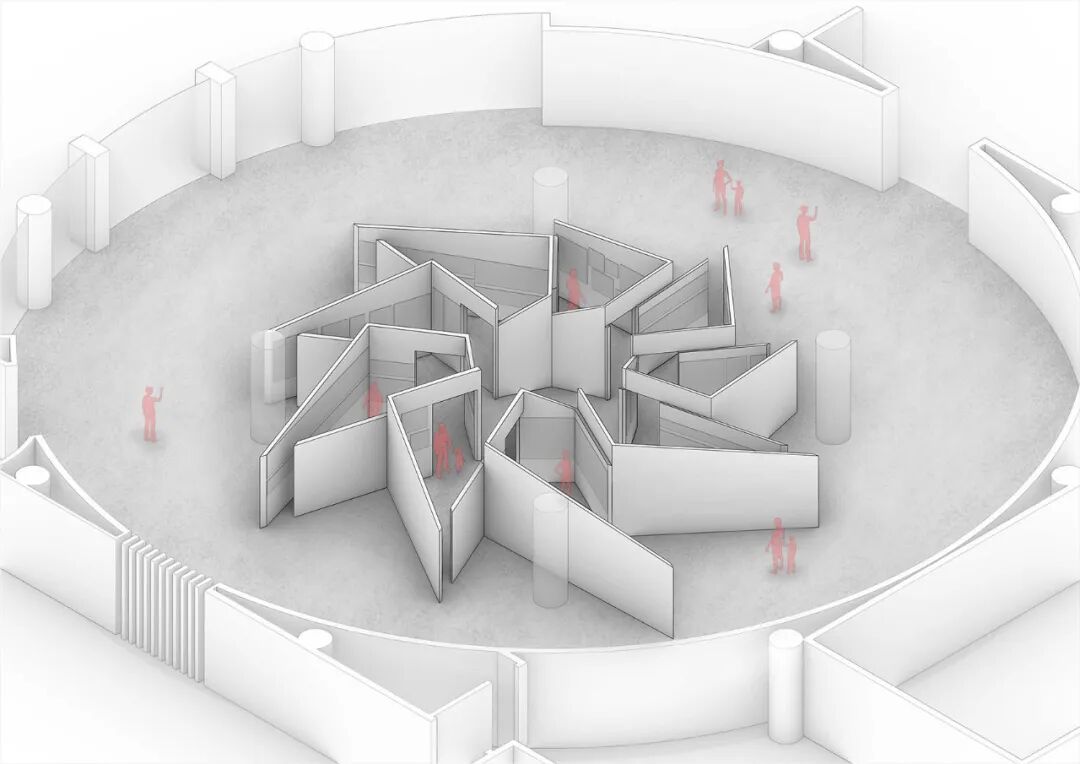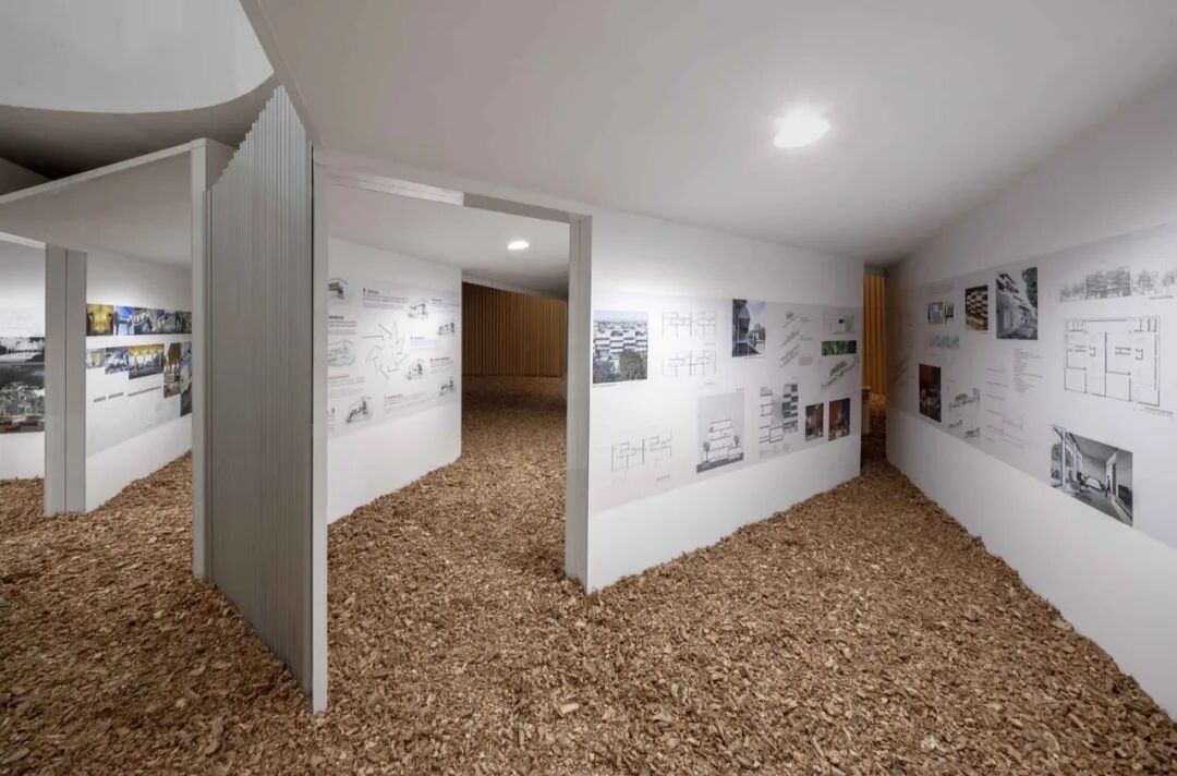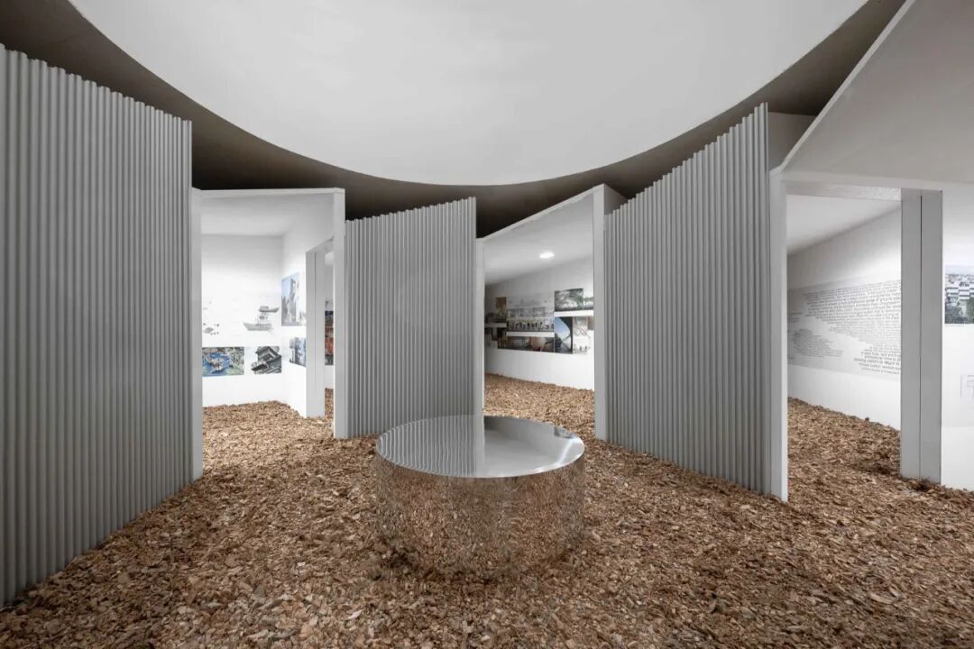 每个展览空间的设计都强调建筑情境的独特性。例如,相处展厅以像素化图形记录热带气候居民的生活方式,仪式展厅则通过条状图形暗示宗教空间的轴线,地域展厅则以竖向堆叠展示材料的构筑方式。这八个展厅的布局引导参观者逐步走向无限中庭,通过镜面圆椅,他们可以模糊地看到天空、地面、建筑以及自己,呈现出大地无限建筑展览的主题。