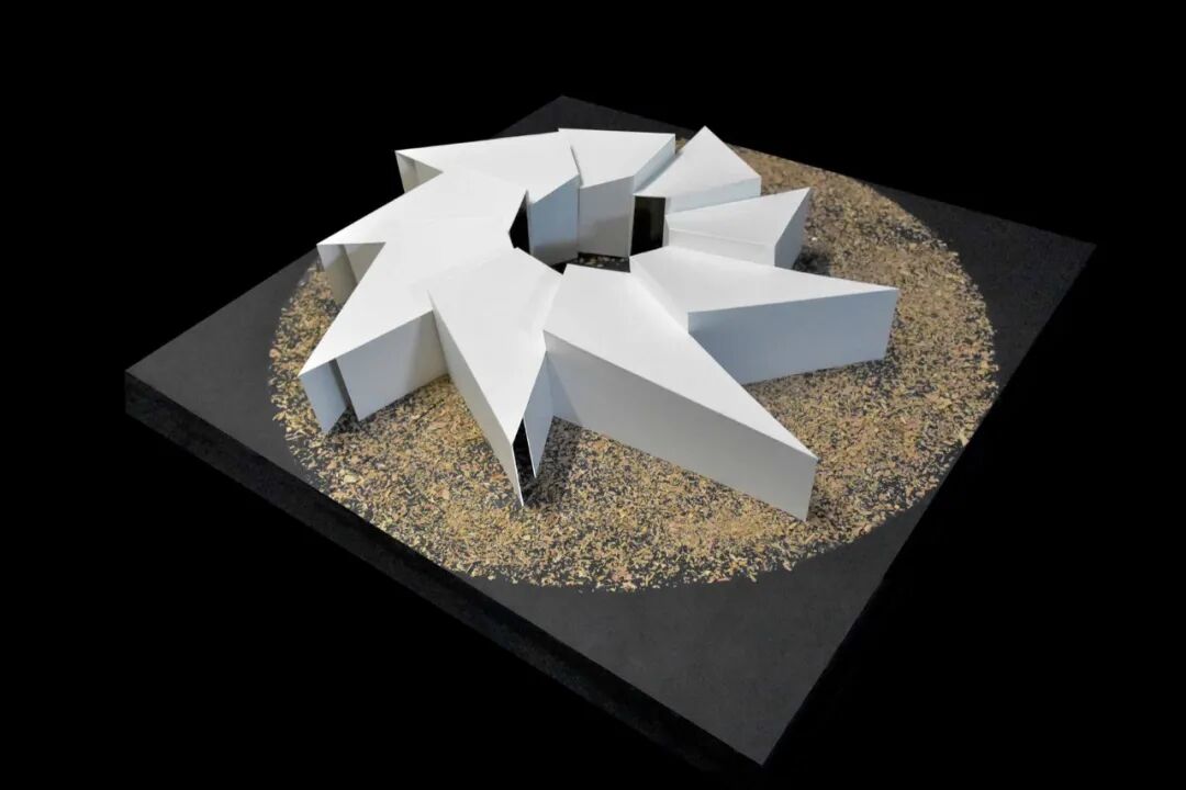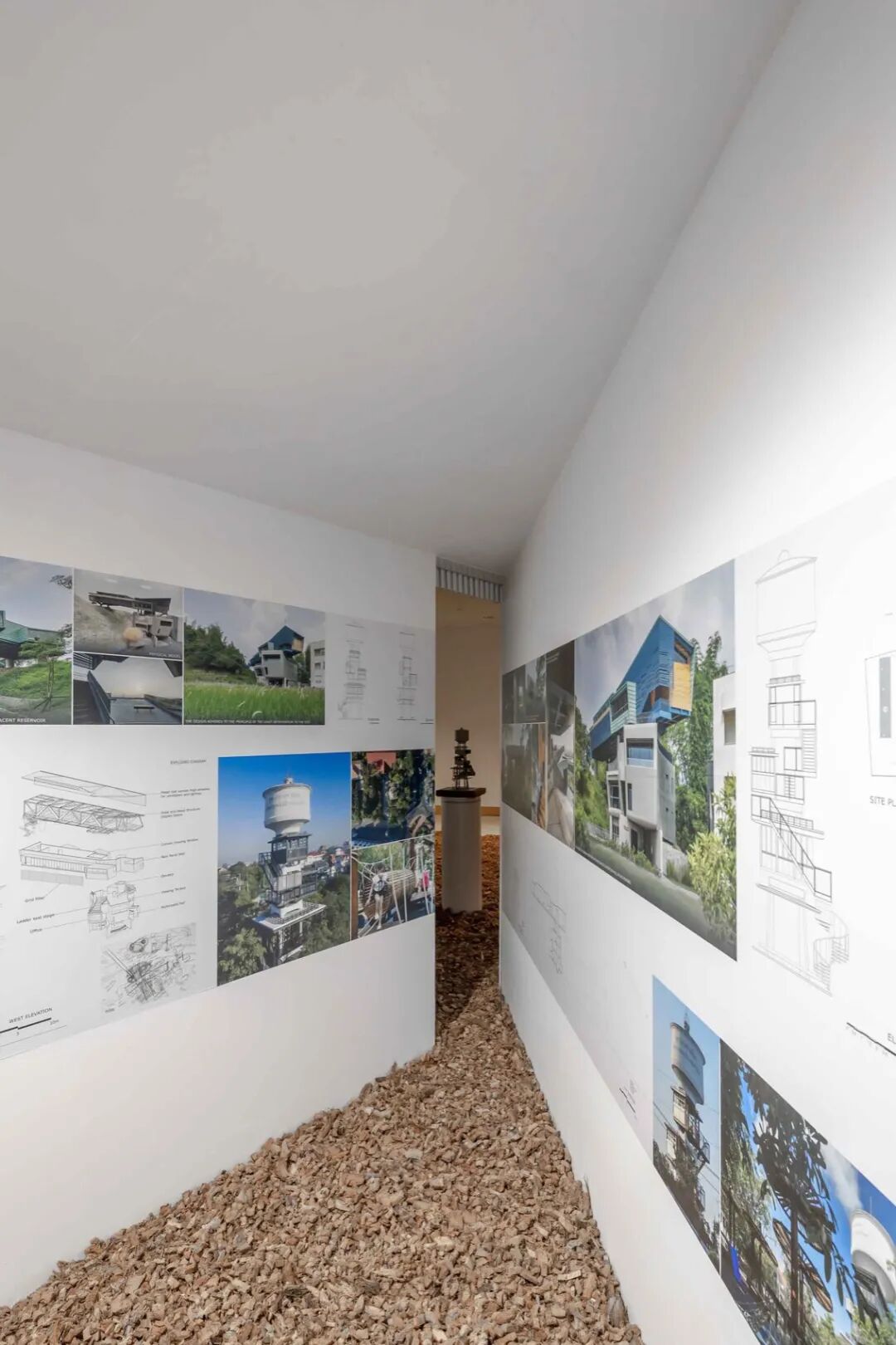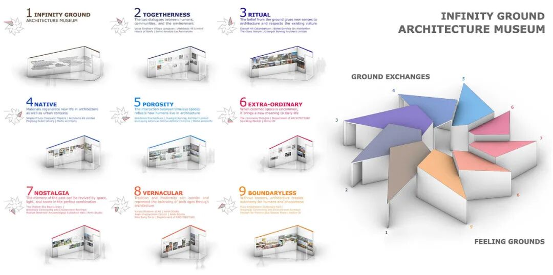 The design features nine undulating sloping roof units that surround the atrium through a clustered approach. At the entrance hall (Ground Hall), visitors can see floating text that creates a floating effect similar to light and shadow shining on the earth. These texts also form a world plate map, symbolizing the drift and aggregation of the earth, and echoing the infinite nature of the earth: Infinity Ground - Thailand and Taiwan Contemporary Architecture Exhibition. In the internal exhibition space, eight quadrilateral exhibition halls of different sizes present eight themes, including Togetherness, Ritual, Native, Porosity, Extra Ordinary, Nostalgia, Vernacular, and Boundaryless, combined with the vertical opening of the exhibition hall axis, framing and extending to the building model outside the space. This design approach creates a unique spatial experience, allowing visitors to feel the connection and exchange between architecture and nature, art and culture through the extension and interaction inside and outside the exhibition space.