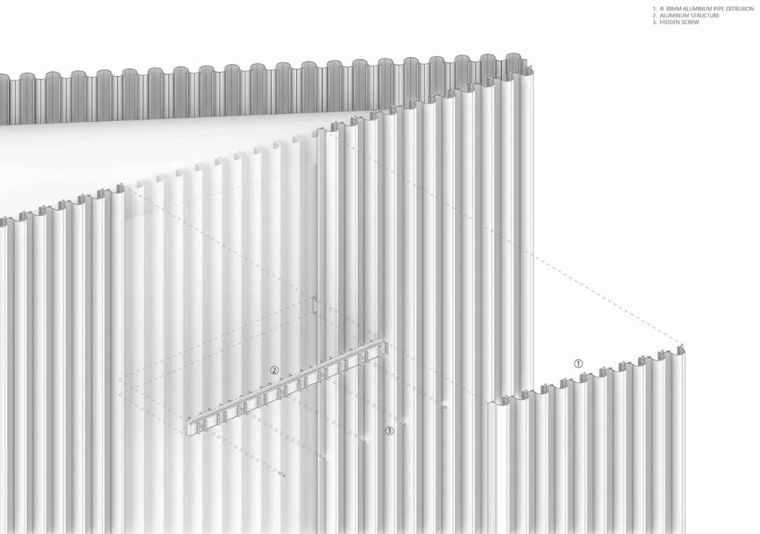 大地无限建筑博物馆采用可回收的材料,其中建筑立面由可重复使用拼接的铝管构成,这是由HAS Design and Research建筑事务所与Alufence合作研发的新型材料。这种材料以扣挂方式组装,无需螺丝,旨在实现建筑材料的重复利用,减少建筑垃圾的产生。