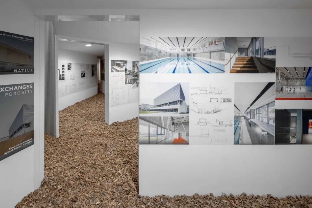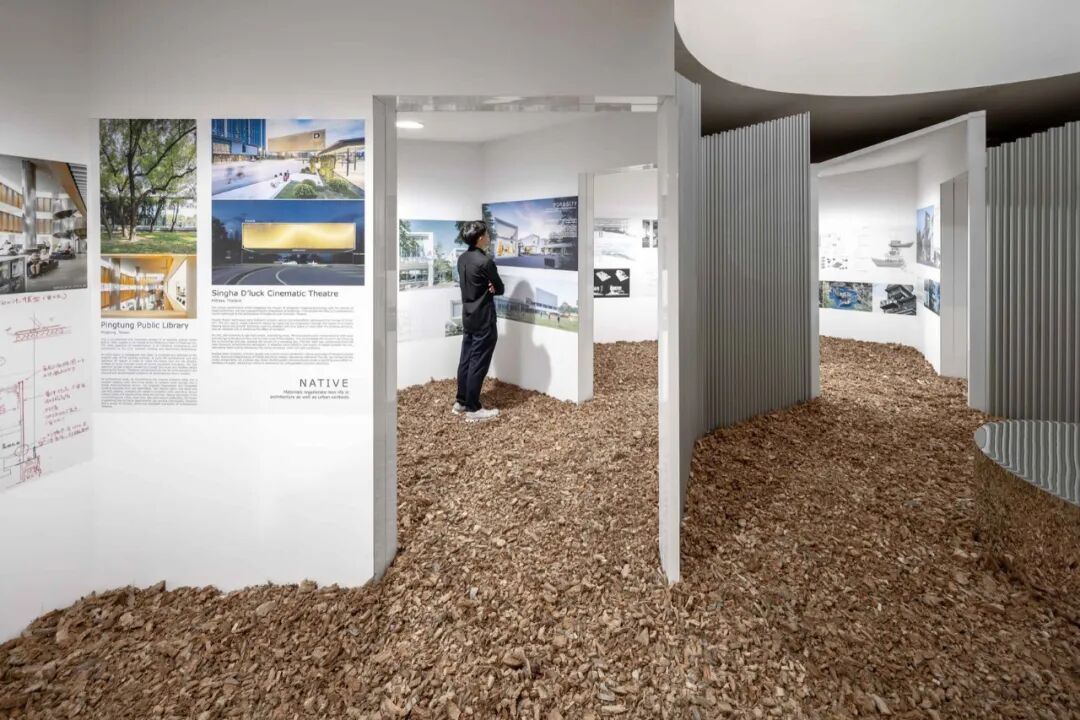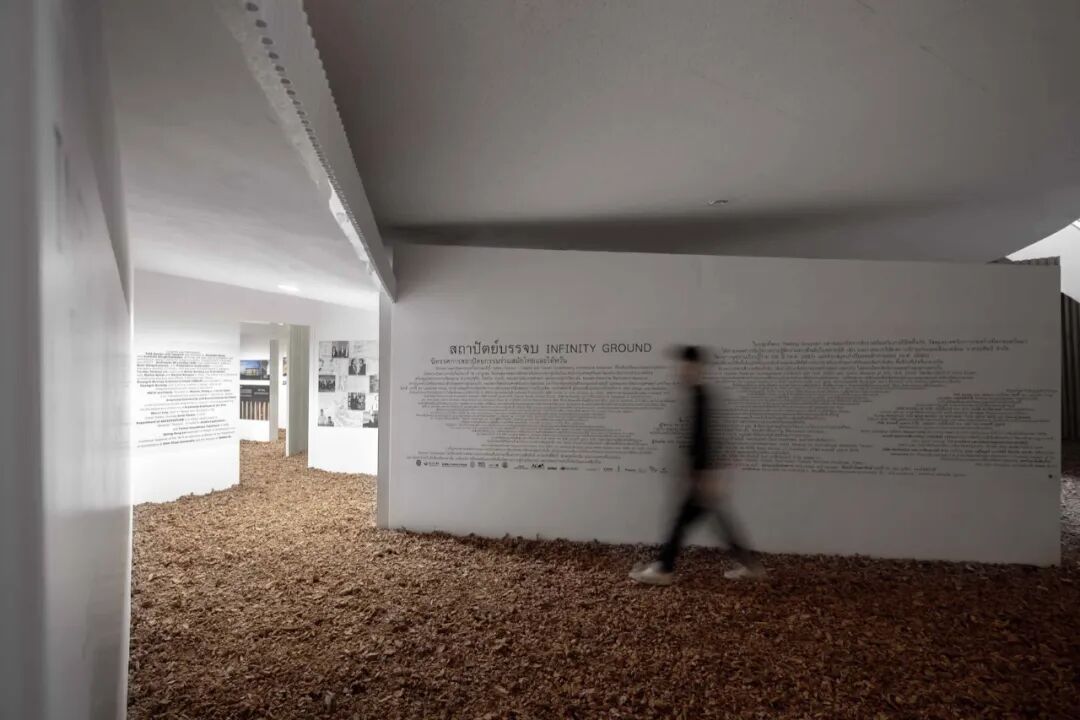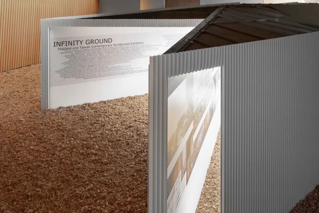 设计以九个高低起伏的坡屋顶单元,藉由聚落方式环绕着中庭挑空。在入口厅(Ground Hall)处,参观者可看到漂浮的文字,塑造出有如光影照射在大地所产生的浮动效果,这些文字也构成世界板块地图,象征着大地的漂移与聚合,也呼应大地无限:泰国台湾当代建筑展(Infinity Ground – Thailand and Taiwan Contemporary Architecture Exhibition)。在内部的展览空间中,八个大小不一的四边形展厅呈现八个主题,包括相处(Togetherness)、仪式(Ritual)、本土(Native)、渗透(Porosity)、超凡(Extra-Ordinary)、怀旧(Nostalgia)、地域(Vernacular)与边界(Boundaryless)等,并结合展厅轴线的竖向开口,框景并延伸至空间外部的建筑模型。这种设计方式创造了一种独特的空间体验,使参观者能够通过展览空间内外的延伸和互动,感受到建筑与自然、艺术与文化之间的联系与交流。