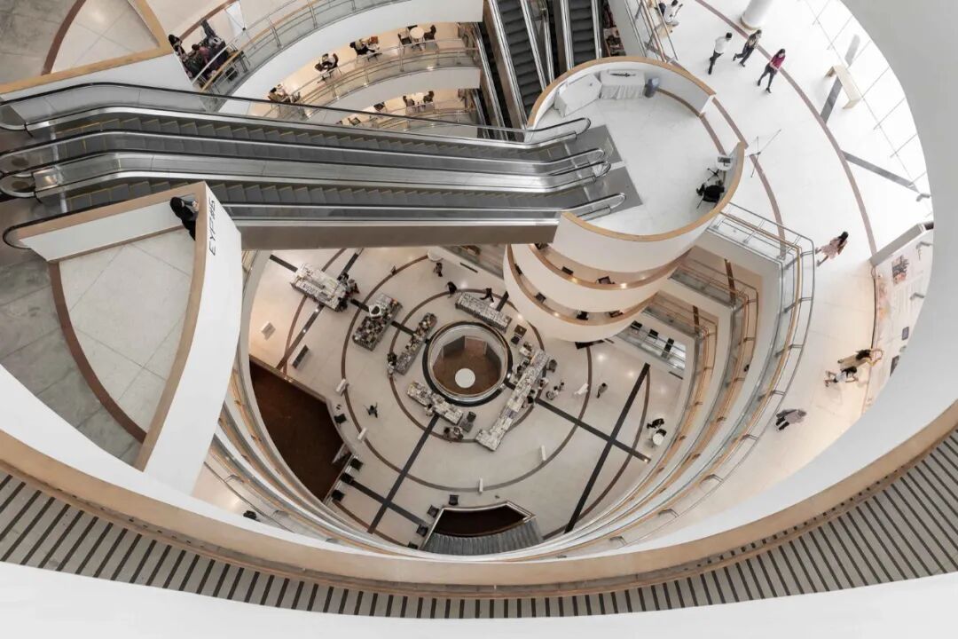 HAS Design and Research建筑事务所将曼谷艺术文化中心的中庭挑空视为空间亮点,该挑空不仅是串连外部环境的“自然孔洞”,更提供内部不同楼层之间的参访互动。在白天,随著不同光影变化,挑空的自然光撒落在地面,其影子有如浮动的大地效果;到了夜晚,随着天空的转变,挑空有如黑洞般,其星空释放出如水纹般的镜面效果。这种设计巧妙地利用了自然光线和影子的变化,创造出一个充满变化和惊喜的空间。白天,挑空让自然光透入室内,营造出一种明亮而开放的氛围,使人们感受到自然与建筑的融合;而夜晚,挑空则变成了一个令人惊叹的星空,为建筑增添了神秘和浪漫的氛围。这种设计不仅提升了建筑的视觉效果,还为人们带来了一种与自然亲近的体验,让他们在空间中感受到时间和自然的流动。