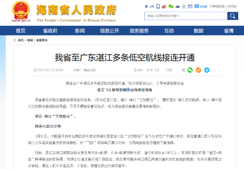 1月23日,据海南省人民政府官网转发的一篇文章称,1月20日至22日,湛江—海口“空铁联运”、 儋州西庆—湛江吴川航线、海口—湛江低空交旅融合航线陆续开通。以湛江—海口“空铁联运”为例,据介绍,湛江西火车站与海口火车站实现直升机跨海接驳,打“飞的”跨海峡只需35分钟;同时,该项目在试运营结束后,将依据实际运营数据,进一步推进建设计划,增设如徐闻港、新海港、湛江北站等多个起降点。