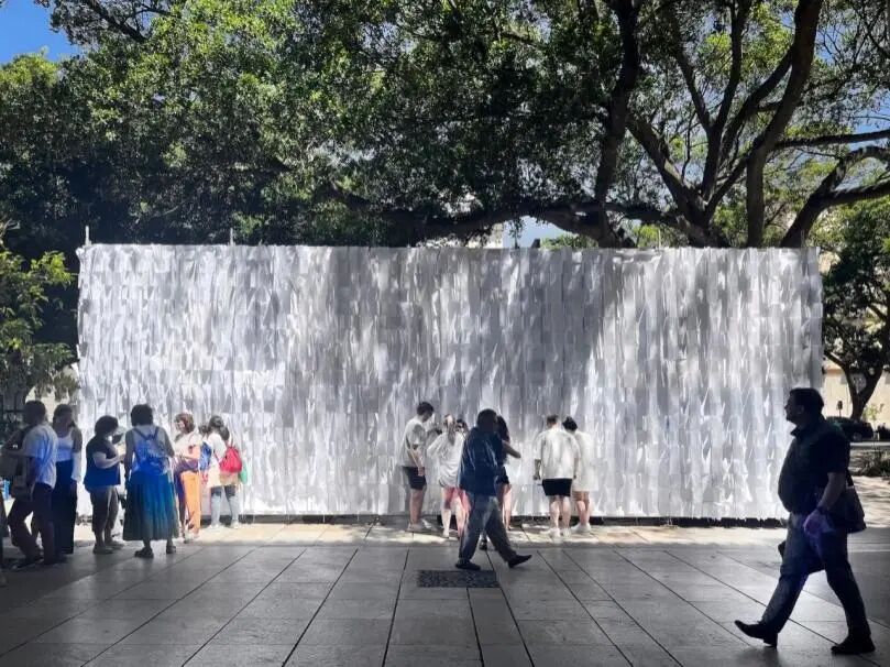 这面覆盖着数千本白纸笔记本的大墙侵入了城市公共空间,并展示着一幅由众人共创而成的巨大拼贴画,这些纸面会随风随机移动,为每一个驻足观看的人提供了无限想象。