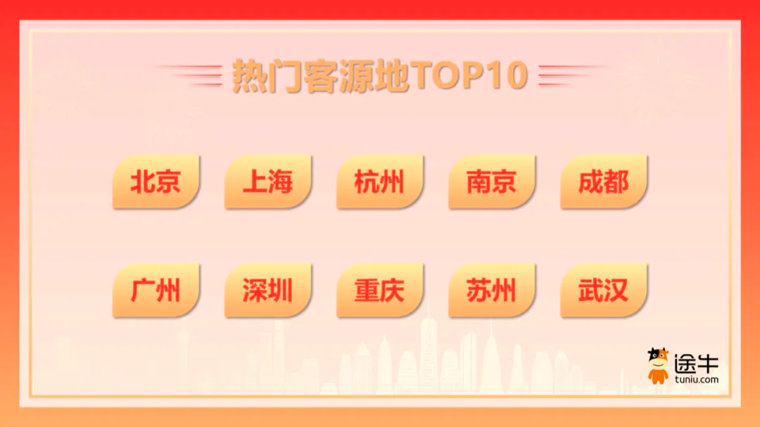 四成用户选择5-6天行程出游在北京、上海、杭州、南京、成都、广州、深圳、重庆、苏州、武汉等地,用户的预订热度位居途牛 “国庆出游热门客源地 TOP” 榜单的前列。此外,海口、乌鲁木齐、呼和浩特、宜昌、银川等三线城市用户的出游热度也实现了显著的提升。在国庆假期,全民的出游热情高涨,国内长线游和出境游的需求增长更为明显。途牛截至目前的预订数据显示,国内长线游的出游人次占比达到 52%,暂时在国庆旅游市场中领跑。出境游的热度继续稳步提升,出游人次占比为 28%。这一比例,随着国庆假期的临近,国内游尤其是周边游订单预订高峰的到来,以及国庆假期较多的临时性出游预订,预计还会有明显的变化。在出游天数方面,途牛用户在国庆假期更倾向于选择 5 - 6 天的出游行程,出游人次占比为 40%,这种选择确保了充分、深度的出游体验;也有近 11% 的用户选择了 8 天以上的出游行程,甚至有用户选择了 20 天以上的出游行程,旅行足迹将遍布欧洲近 10 个国家。
