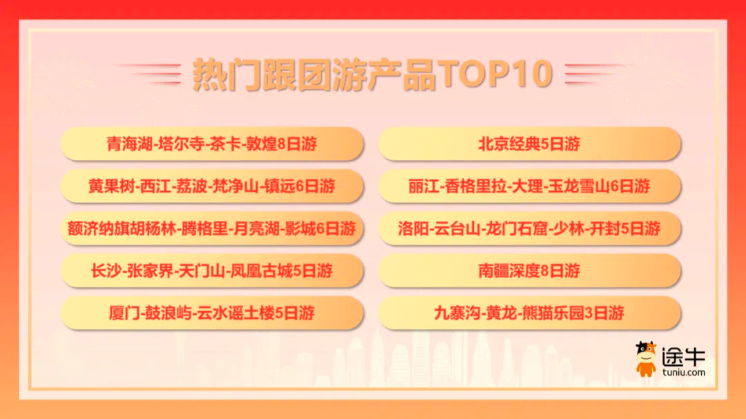 《报告》数据显示,黄果树瀑布、庐山、婺源、黄山、宏村、张家界天门山、新疆喀纳斯、额济纳旗胡杨林等赏秋目的地也是途牛用户国庆出游的预订热门之选。相关目的地的 “黄山全景观日出 - 宏村 3 日游”“黄果树 - 西江 - 荔波 - 梵净山 - 镇远 6 日游”“额济纳旗胡杨林 - 腾格里 - 月亮湖 - 影城 6 日游”“长沙 - 张家界 - 天门山 - 凤凰古城 5 日游”“庐山 - 景德镇 - 婺源 - 三清山 6 日游” 等赏秋主题旅游产品吸引了众多摄影爱好者以及赏秋游用户的关注。9 月以来,山西太原、大同、忻州,甘肃兰州、张掖、敦煌,以及河南郑州、开封、洛阳等传统文化游目的地的预订热度持续攀升,其中,国庆团期的 “壶口 - 悬空寺 - 平遥 - 五台山 - 云冈 7 日游”“青海湖 - 塔尔寺 - 茶卡 - 敦煌 8 日游”“洛阳 - 云台山 - 龙门石窟 - 少林 - 开封 5 日游” 等传统文化主题的跟团游产品预订尤为火热。此外,“石窟艺术大赏武威天梯山 - 马蹄寺 - 莫高窟 6 日游”“敦煌一地深度游:莫高窟 - 榆林窟 5 日游” 等小众、深度的主题旅游产品也深受年轻用户的喜爱。国庆假期也是金秋赏景的最佳时节。