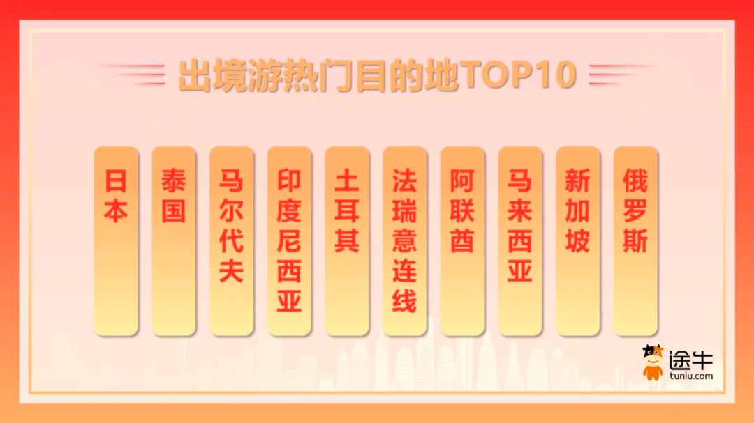 在出境游方面,出境短线游的人气更为旺盛,其出游人次在出境游用户中所占的比例达到了 61%,而出境长线游的增长趋势则更为明显,出游人次占比为 39%。在出境游的热门目的地中,日本、泰国、马尔代夫、印度尼西亚、土耳其、法瑞意连线、阿联酋、马来西亚、新加坡、俄罗斯等目的地的预订热度排名较为靠前。此外,塞尔维亚 - 黑山共和国 - 波黑连线、格鲁吉亚 - 亚美尼亚 - 阿塞拜疆连线、捷克 - 匈牙利 - 奥地利连线等新兴目的地也在国庆假期迎来了热度的高峰,成为了不少资深旅游达人以及追求独特体验的用户的热门之选。