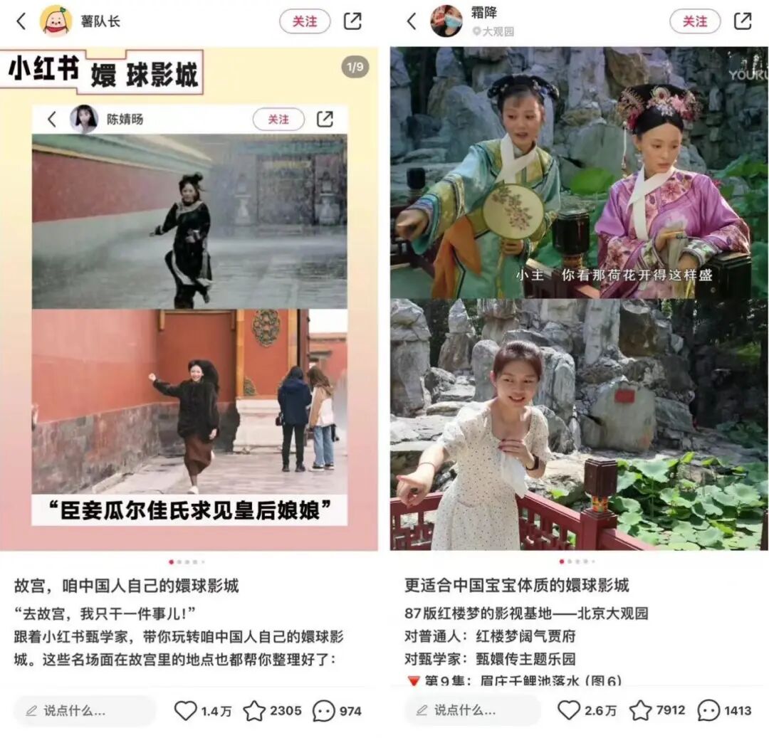 与此同时,主题乐园能够熨贴地容纳游客的怀旧、喜爱等情绪和创造力。即使没有官方推出的主题乐园,许多游客也会自发将喜爱的IP搬至现实,随时随地创造“主题乐园”。爆款清朝古装宫廷电视剧《甄嬛传》在B站、抖音等视频平台上持续走红,十年热度不减。只要有雪天和树,观众便可仿照《甄嬛传》的情节将其挂满红色剪纸小像。社交媒体小红书的“十级甄学家”(指喜爱《甄嬛传》、多次观看并深扒剧集细节的观众)在北京故宫和大观园游玩时会模仿《甄嬛传》的名场面打卡拍照,获得“造梗”的快乐和同好的共鸣,从而在网络语境中仿照“环球影城”打造出“嬛球影城”主题乐园,展现出了中国影视资源IP成为主题乐园的群众需求和市场潜力。