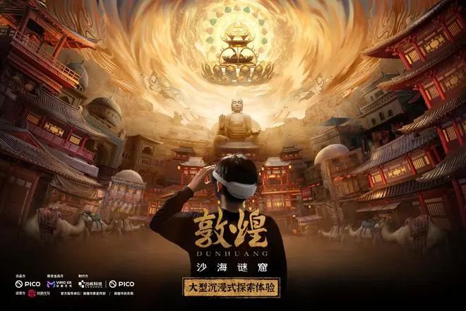 《敦煌:沙海迷窟》是由VR硬件厂商PICO与新锐科技娱乐品牌VIMO XR携手打造的大型沉浸式探索体验游戏,并得到了敦煌市委宣传部与敦煌市商务局的官方授权与合作支持。其以大唐元和十年(公元815年)为背景,讲述了一段关于神秘法器曼扎宝盘的传奇故事。该 VR 项目采用了影视级互动叙事超级空间技术,为体验者带来了前所未有的沉浸感和互动性。通过高精度空间定位、多人互动和实时渲染技术,结合高性能背包所具备的高精度图形处理能力,项目成功地将逼真的场景与宏大的视觉艺术融为一体,为体验者打造了一个既真实又充满参与感的多人组队沉浸式娱乐体验。