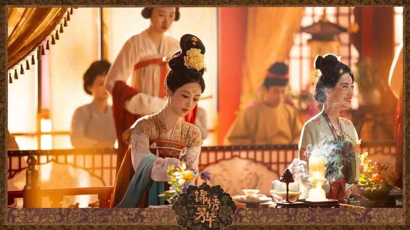 《锦绣芳华》中的“唐风”带动了全媒体的传统文化热潮。在社交媒体上,陕西唐三彩艺术博物馆等官方账号发文科普,揭示剧中服饰、配饰、道具装饰等道具与文物原型的对应关系,引发了众多网友边逛博物馆边品剧集细节的“考古式追剧”热潮。与此同时,数字文博平台山海APP与多名文物科普博主联动,从《锦绣芳华》中的屏风壁画、地毯道具上的宝相花纹等切入解读,同网友们一起解码传统文化知识、欣赏国风美学。镂空竹、傩面具、风火流星、长沙铜红釉、八角宫灯……许多网友自发“扒细节”科普剧集非遗元素的行为,也成为该剧热播过程中一道独特的互动传播路径。从赏味荧屏细节到破圈文化科普,《锦绣芳华》让观众们得以在视听沉浸中感知历史长河中的文化之美,于文化共鸣里完成一次跨越千年的审美对话。
