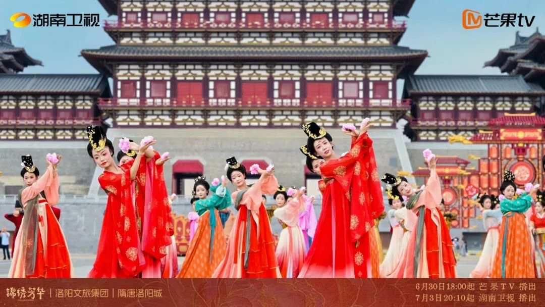 (图片:伴随着电视剧《锦绣芳华》主题曲的旋律,百名舞者身穿唐装、手持牡丹,在应天门广场翩翩起舞|来源:网络公开)