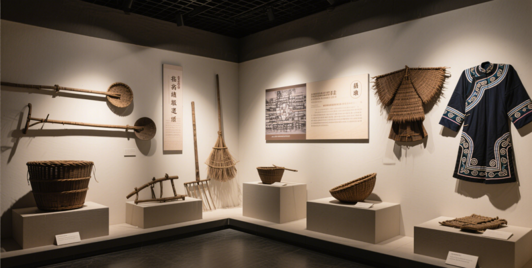 此展厅设计简约而富有质感,以浅灰色墙面为背景,搭配同色系展台,营造出质朴沉稳的氛围。柔和的灯光从上方打落,勾勒出展品轮廓,使其细节清晰可见。传统农具、竹编器物、特色服饰等展品错落有致地陈列,或悬挂于墙面,或摆放于展台,高低有序。墙上展板图文并茂,补充展品背后的文化内涵,参观者仿若置身时光隧道,能直观感受传统农耕文化的魅力与底蕴。