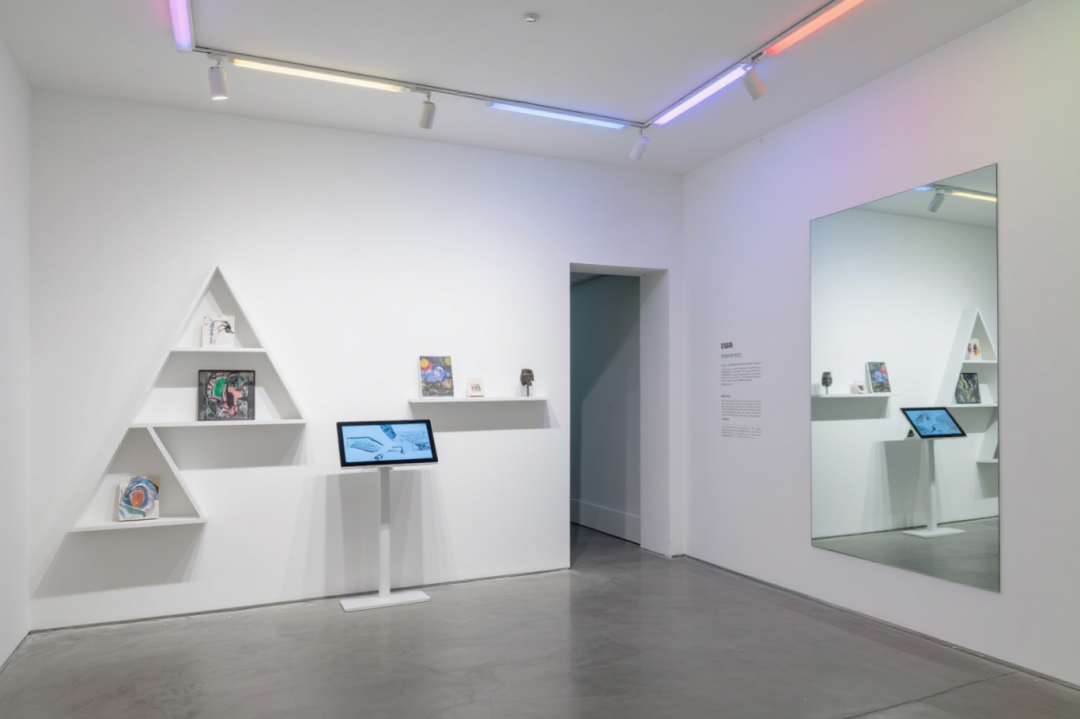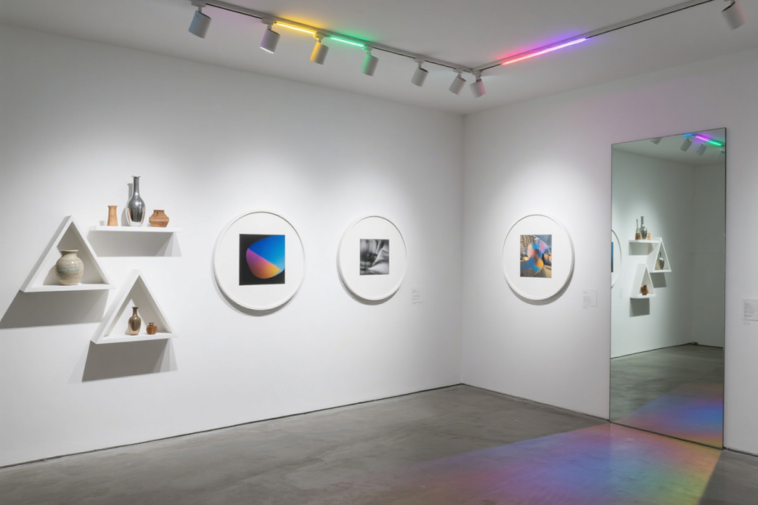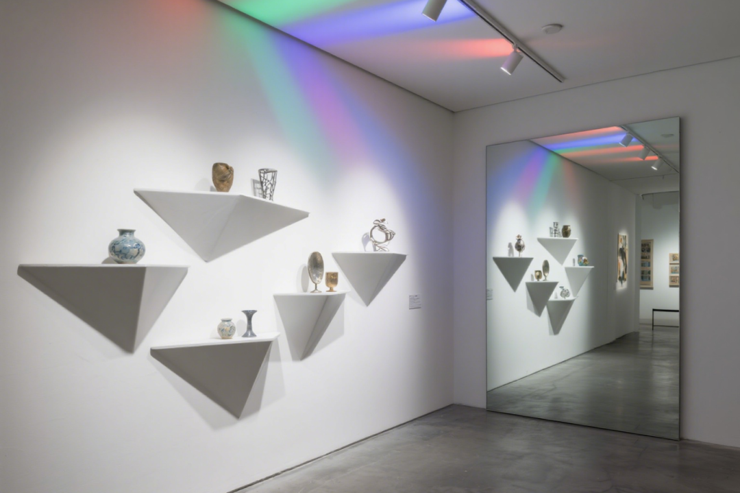 简洁白色空间,因彩色轨道灯的介入瞬间灵动 —— 红绿蓝紫的光线,如打翻的调色盘倾洒而下,在墙面、地面晕染出梦幻光晕。错落的三角形置物架,像被精心编排的 “艺术舞台”,陶瓷的温润、金属的冷硬、手工器物的独特纹理,在此碰撞出奇妙火花。一侧巨镜拓宽空间维度,让光影与器物无限延展,行走其中,仿佛踏入时尚与艺术共舞的实验场,每一束光、每一件展品,都在点亮独属于当代审美的奇思妙想。