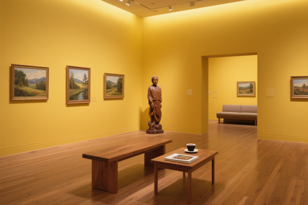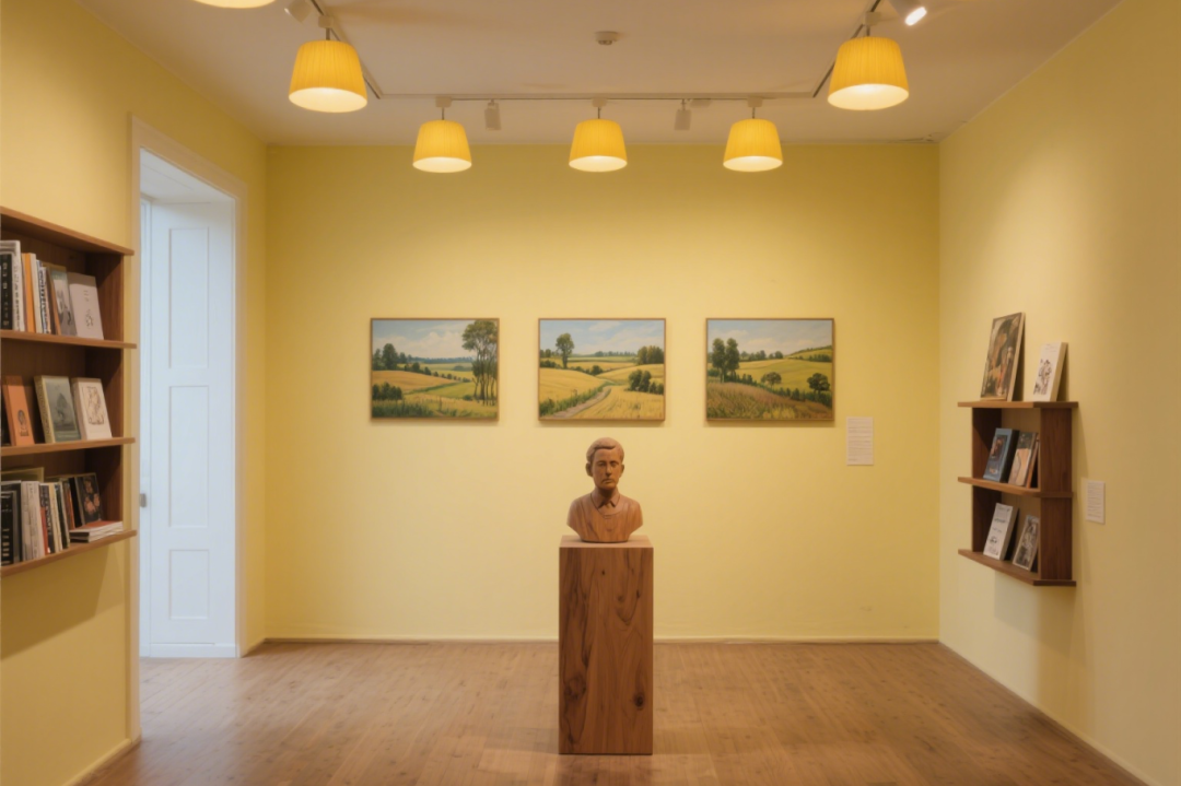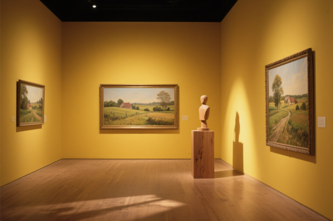 暖黄墙面晕染出午后阳光般的温柔,三幅田园油画将乡间诗意原封不动搬进展厅,笔触里的麦浪、屋舍、绿树,连带着清新空气扑面而来。简约木雕半身像静静伫立,与画作形成 “对话”。浅木色地板承接光影,将阳光切割成柔和斑块,整个空间静谧又怀旧,像是为都市人预留的 “心灵牧场”,每一幅画都在轻吟岁月沉淀的田园故事,用细腻笔触治愈喧嚣与疲惫。
