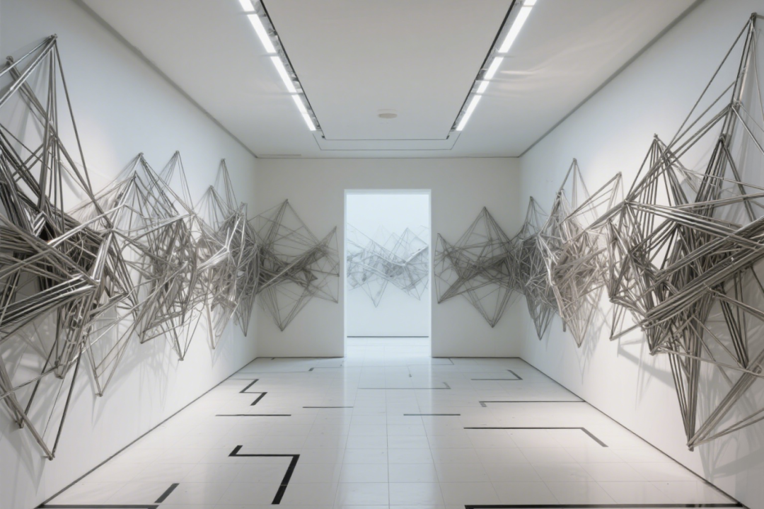 以纯粹白色为空间底色,利落的金属线条如被赋予生命,相互交织、扭转为复杂几何形态,恰似宇宙中悬浮的神秘星轨,有序又充满未知。墙面成为线条肆意生长的画布,地面黑白几何线条则如无声指引,延伸至空间深处。冷冽的工业质感与艺术创意激烈碰撞,每一根硬朗线条都暗藏空间韵律,行走其间,仿佛踏入被金属与光影重构的未来场域,沉浸式感受现代艺术对 “结构” 与 “秩序” 的大胆解构。