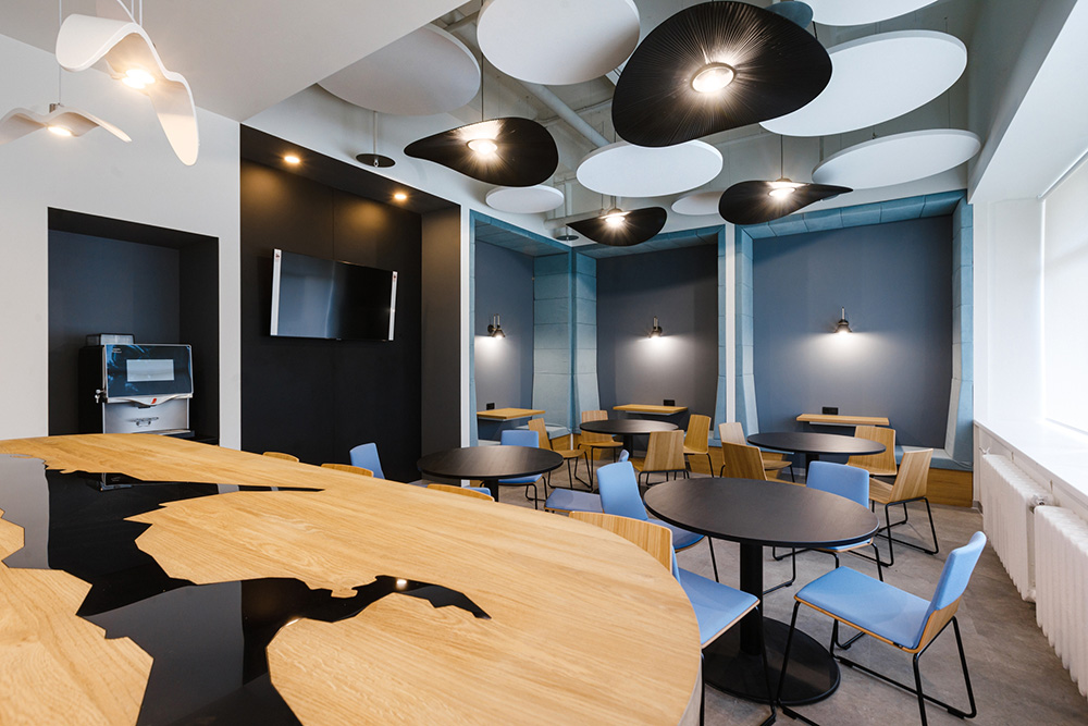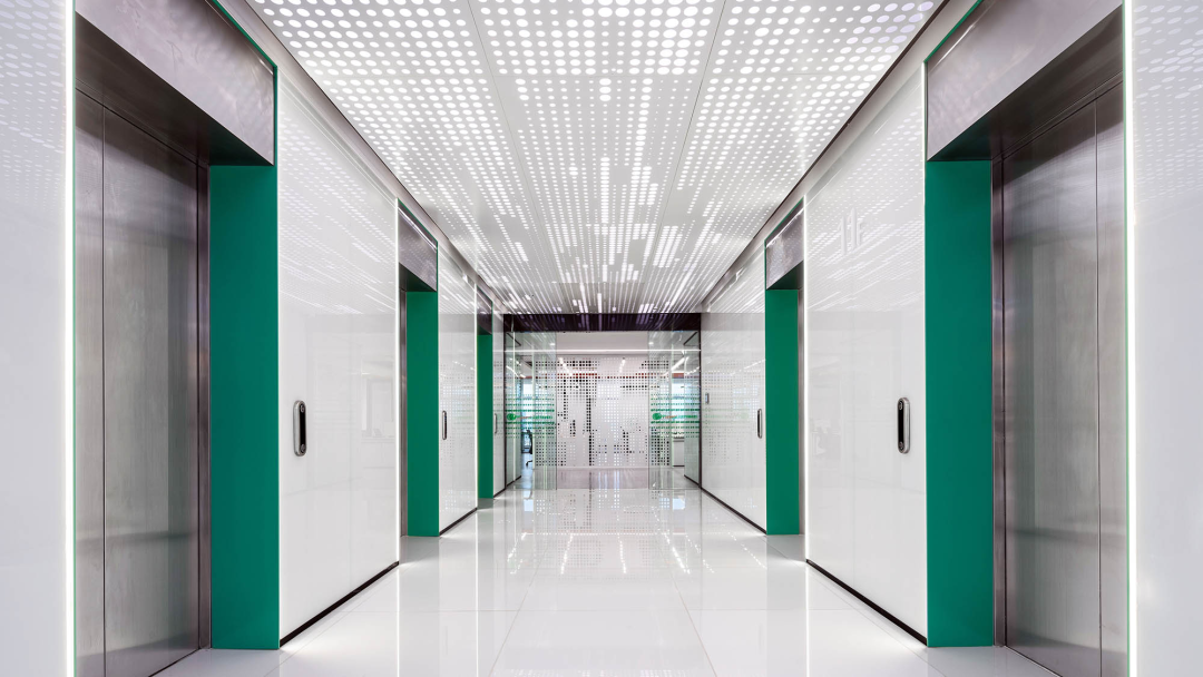 项目背景与设计巧思 华为新西伯利亚办事处位于学院城哥罗多克(Academgorodok),设计团队对一座研究所老建筑进行改造,核心巧思是化劣势为优势:将建筑自带的橱柜走廊系统这一“缺点”,转化为空间设计的核心亮点。