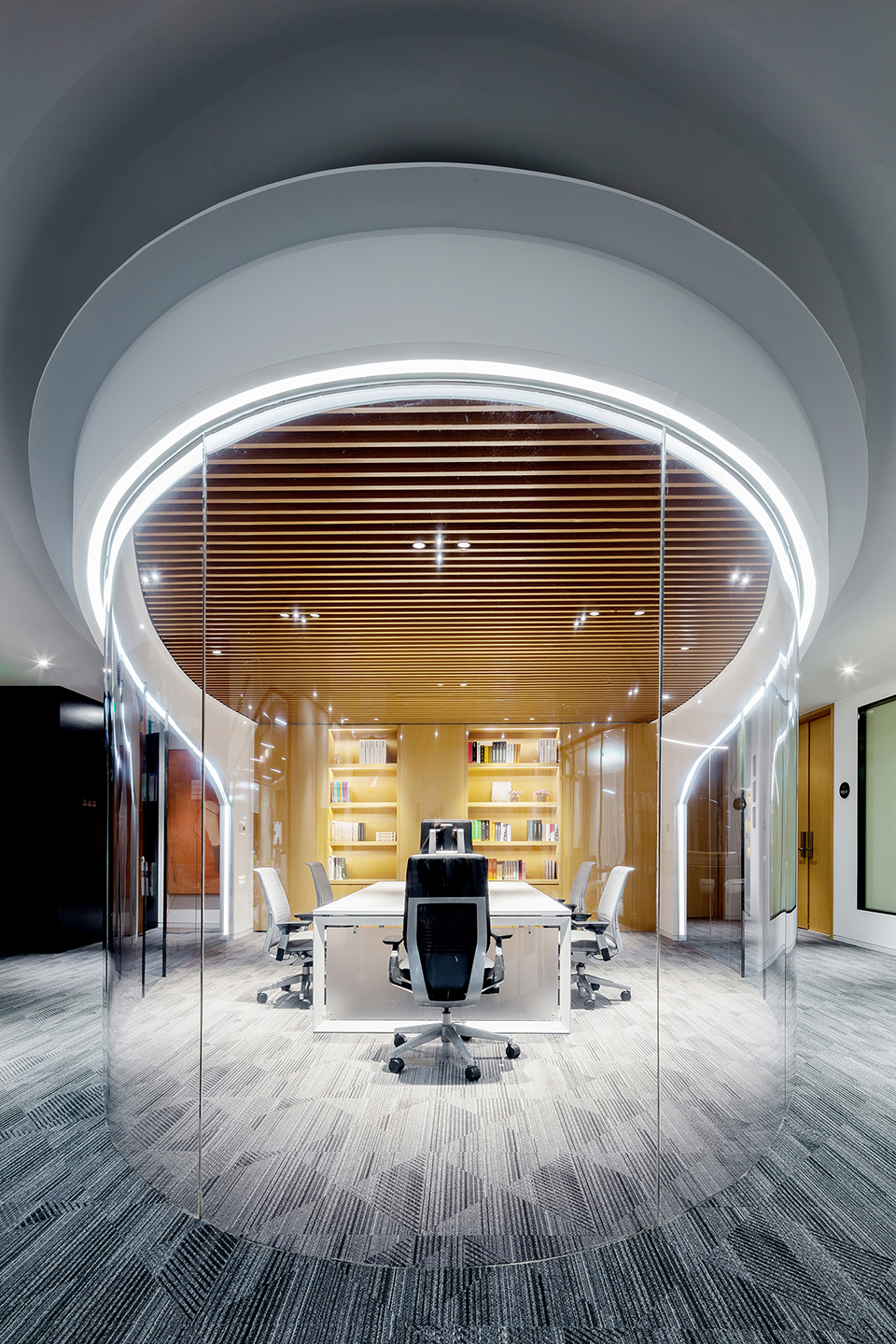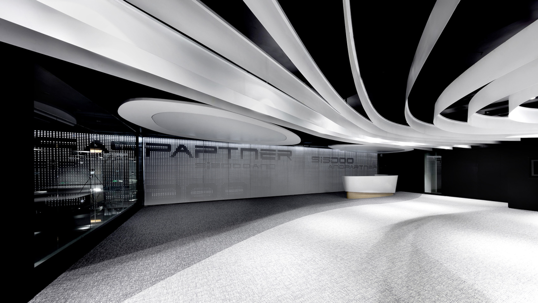设计初衷与核心挑战 该项目旨在通过空间设计传达公司愿景,核心挑战是平衡品牌展示与专业办公的双重需求,设计核心遵循“科技与人类融合”的未来空间理念,重点关注来访者的空间感受与思考过程,通过多元设计元素打造丰富的体验感。 ### 空间体验设计 来访者的体验动线被精心规划:步入电梯穿过时光隧道,进入展厅大堂;移门开启后,象征头脑风暴的中枢核心区域映入眼帘,彰显品牌高度。 该空间融入大量高科技元素,智能化灯光变幻与环绕式视频投影强化了未来感与科技感;作为公司前台与品牌展示区的核心区域,设计上“去繁就简”,以极简、神秘的空间风格减少冗余装饰,突出品牌对未来的展望。