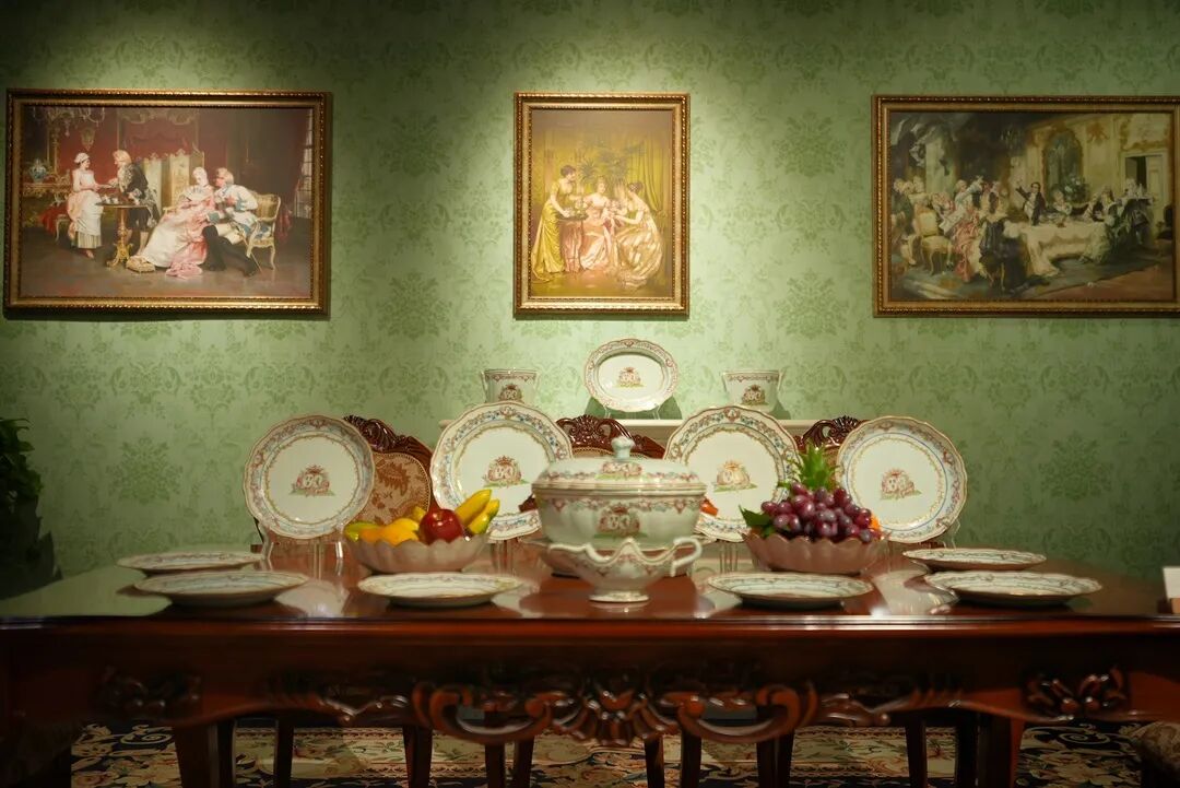 在第二单元设置了西方韵味的打卡空间,还原了油画中西方就餐时的场景,沉浸式地感受中国外销瓷对西方饮食的影响。