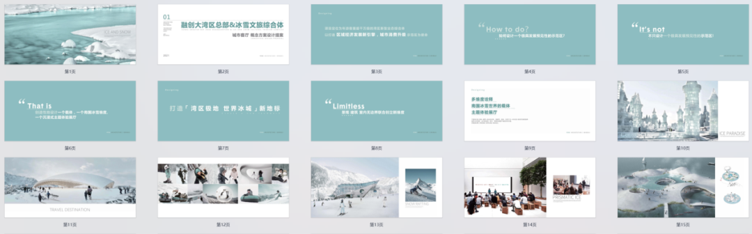 本案的总页数为170页,如果这是一次20分钟以内的汇报,那么以平均5秒/页的翻页节奏,整体述标的观感比较舒缓,实现由感性冲击,到理性论证,再到情感升华的螺旋式推进,可以让听众(政府、投资者、公众)在递进的情感共鸣中自然接受方案的观点,堪称概念方案节奏设计的范本。
