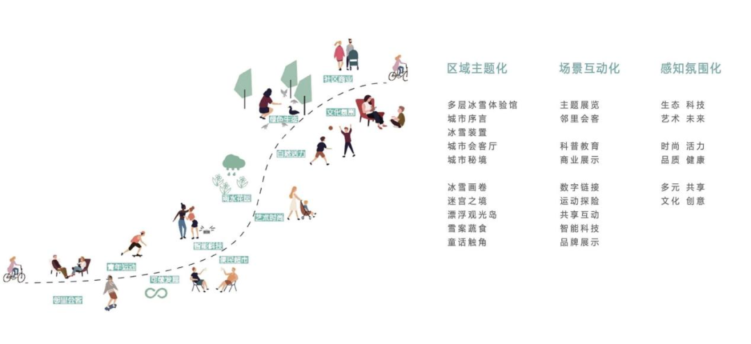 从“讲故事”到“沉浸故事”,通过技术、空间与业态的跨界整合,本案构建起一个大家 可感知、可想象、可参与、可消费的冰雪主题“平行世界”。