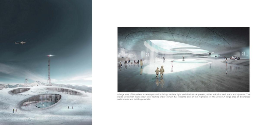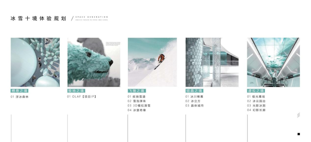 在介绍各类体验项目时,依旧先是通过“3D模拟滑雪”“极光幕场”“幻影长廊”这类等强符号化IP设计,结合景观装置与建筑形态,形成 可传播的记忆点。