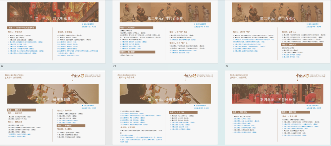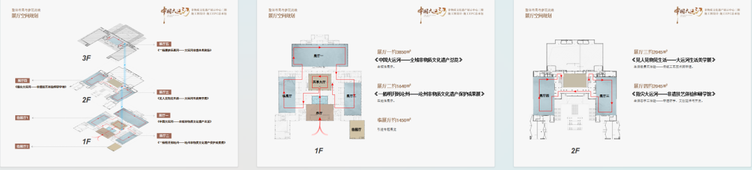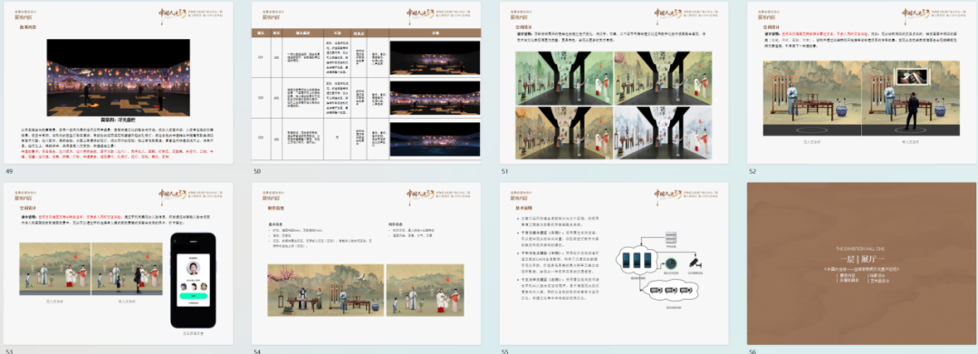 介绍展厅具体呈现效果,其中根据每个展厅内的具体展项、展品区别,衍生了包括平面布置+设计构思+展陈模式+内容解读+参观动线+重点亮点标注+设计亮点等不同的内容页。
