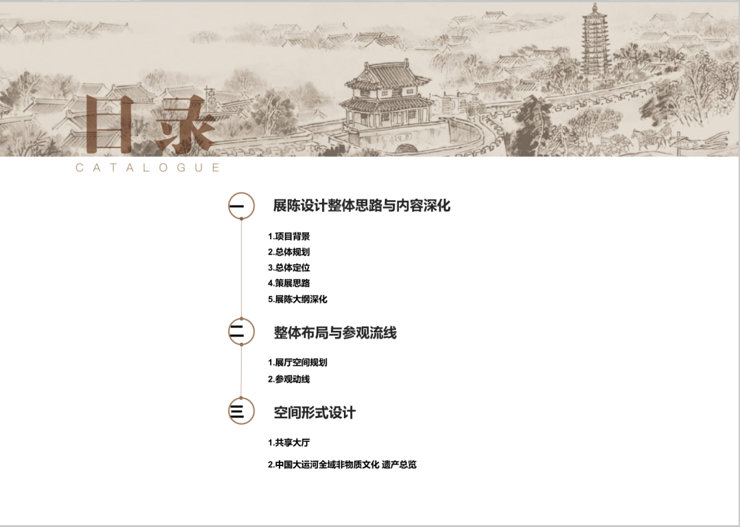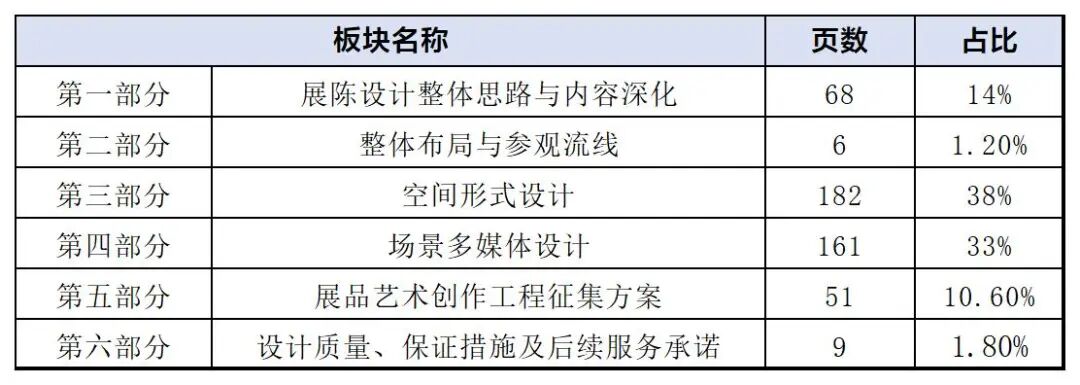 其中第一部分“展陈设计整体思路与内容深化”,所占篇幅约为整案的七分之一。包含了项目背景、设计概况及设计范围、项目定位、受众定位、展览主题、主题诠释和展览内容。整体逻辑前后承接、一目了然,能够最快速度让与会众人了解项目状况,达成共识,这也与我们之前的[p]“看个门道”系列文章[/p]点彼此印证。