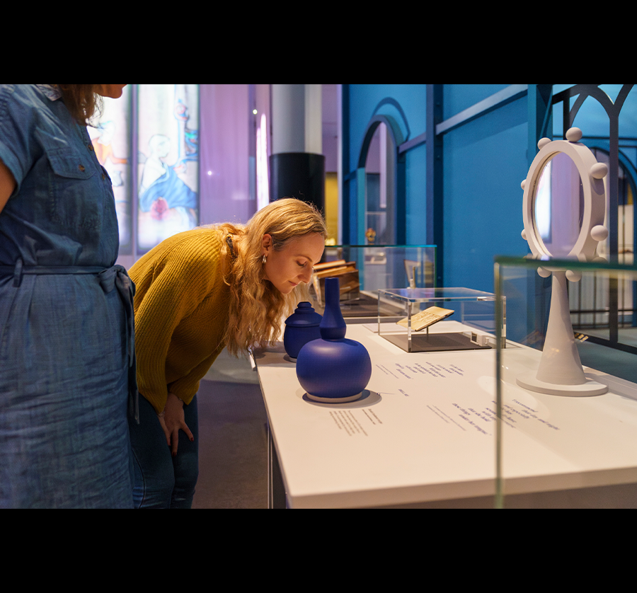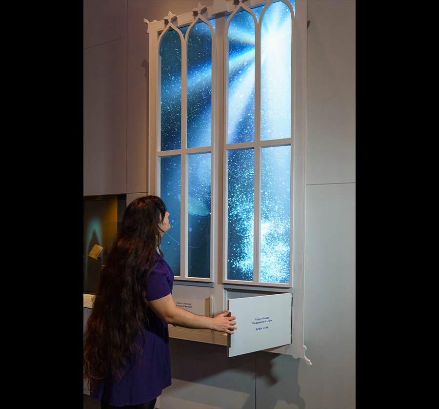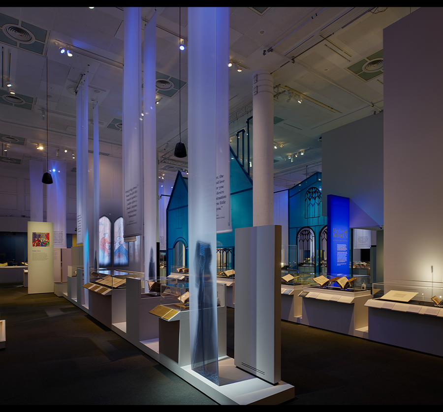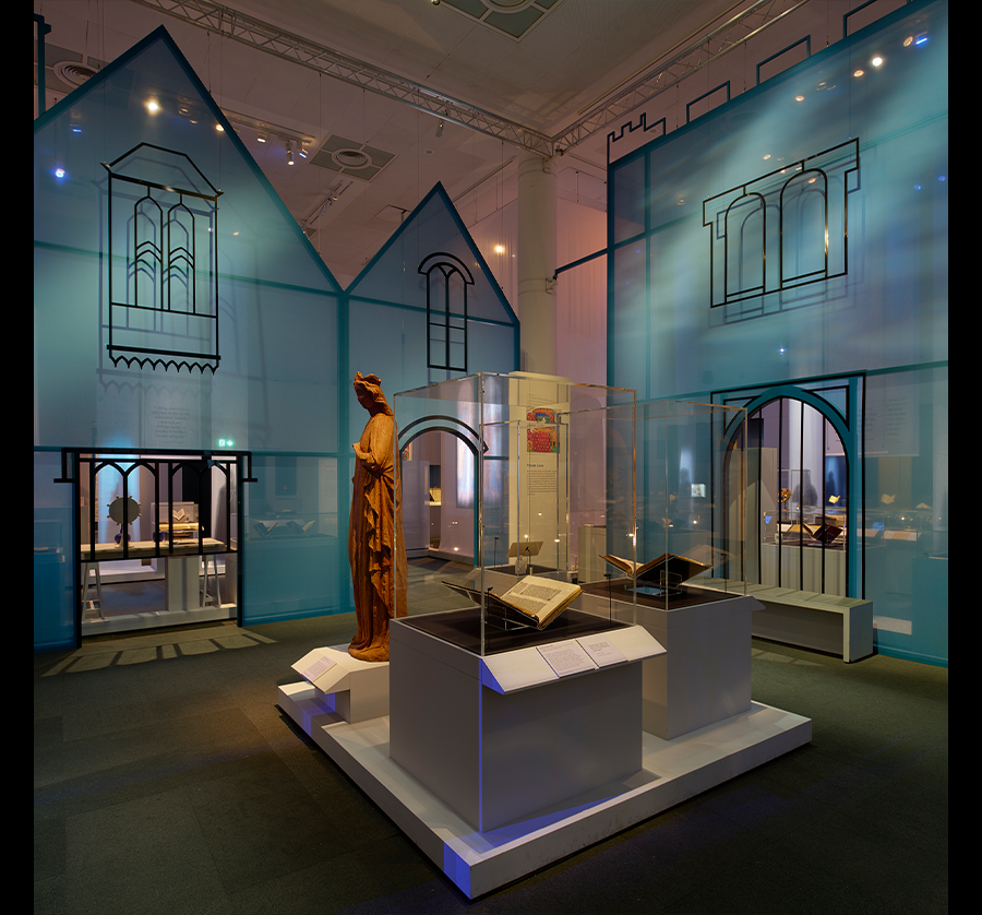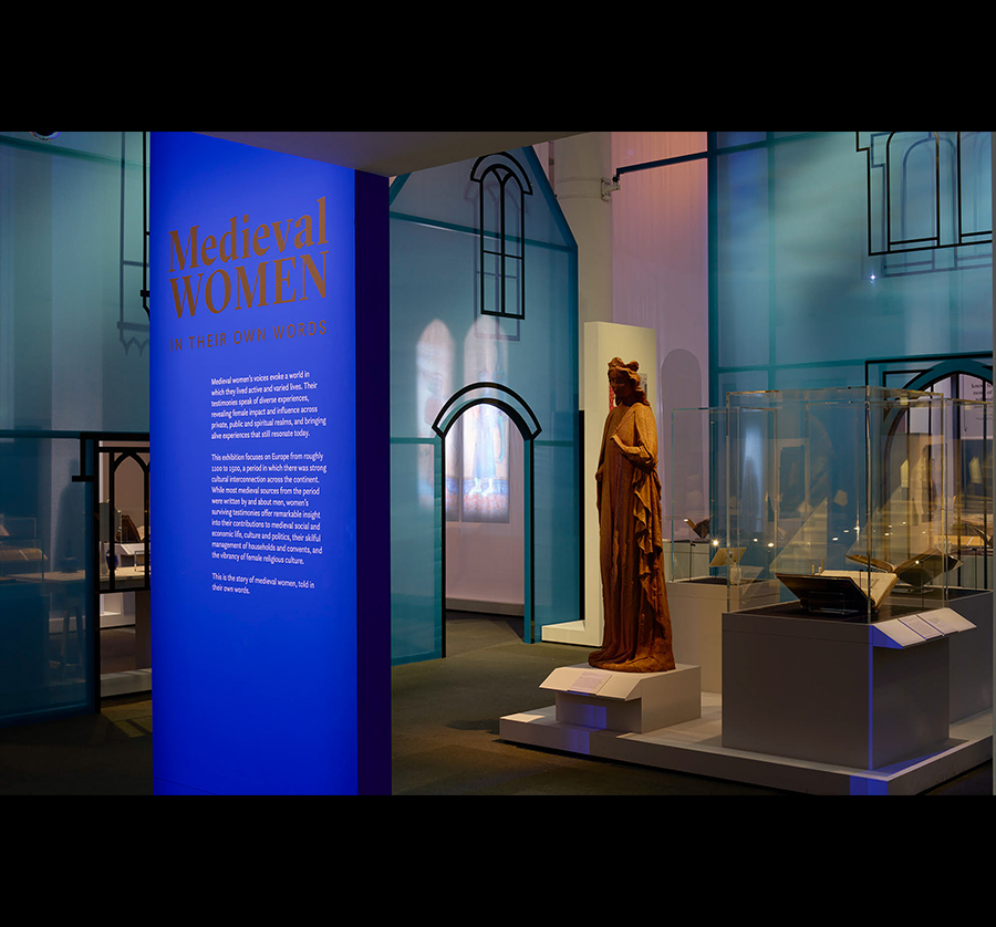 展览空间仿教堂或修道院建筑风格,高大窗户与隔断投下长影,营造出沉浸式氛围,使观众专注于展品,感受中世纪女性的多彩人生。