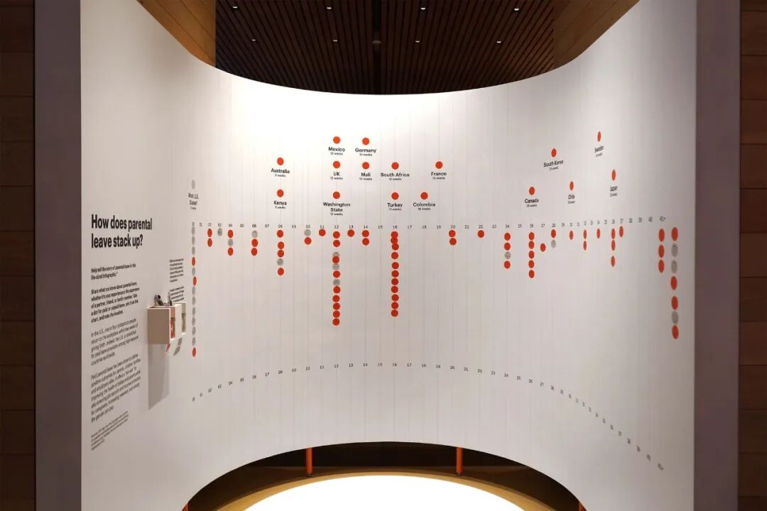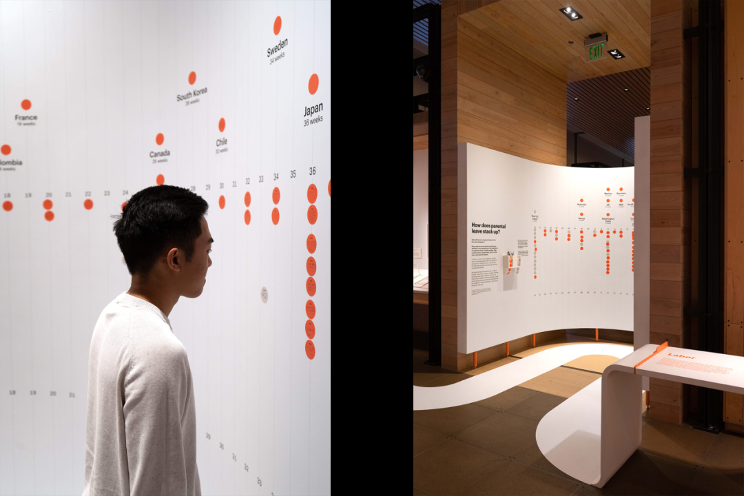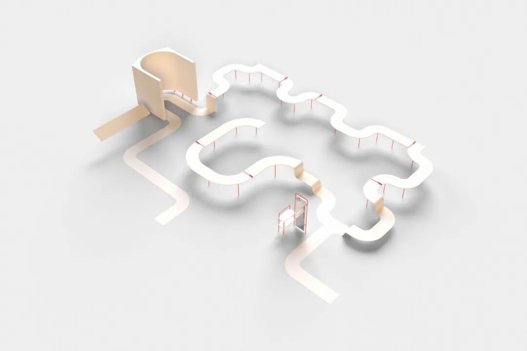 以蜿蜒的 “脐带桌” 按怀孕阶段梳理展品,引入白色作为背景,呼应网格建筑,建立模块化展示系统,增强小物件视觉效果,营造有序且具引导性的参观空间。