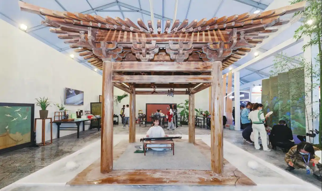 2022年,温州文博会上刮起了一股“低碳风”。以2号馆文成馆为例,馆正中是网红青年苏清吾按照省级非遗项目“南田民居营造技艺”建造的宋风亭,采用文成县本地民居的木材和废弃木料搭建,馆内用砧板、碎玻璃等制作展品,盆景采用吸水石盆器,展会结束后整体迁移至创意园,避免材料浪费。