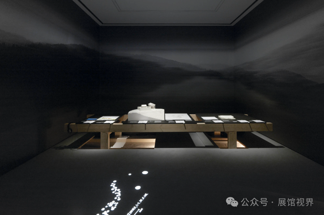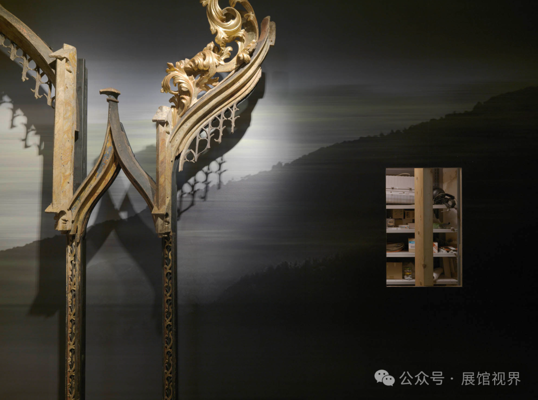 将中性的外壳转变为一个艺术化的景观,不经人手,是第一步。一个无限的景观环线包裹着墙壁(Eva Stern的艺术作品),隐喻着人类在地球上发现的原始自然,然后被连续地修改、重塑和改造。这些人类干预的痕迹作为景观和墙壁上的缝隙变得清晰可辨,同时也在宫殿的历史背景下将物体之间的联系联系起来。