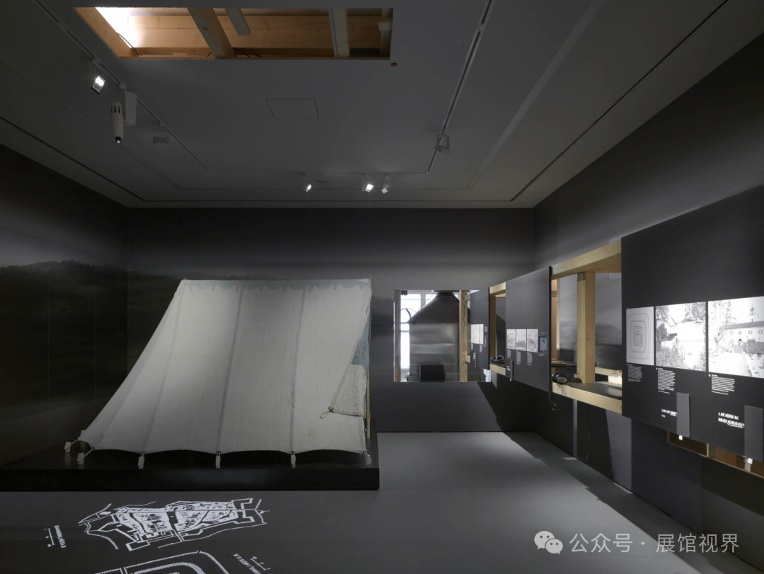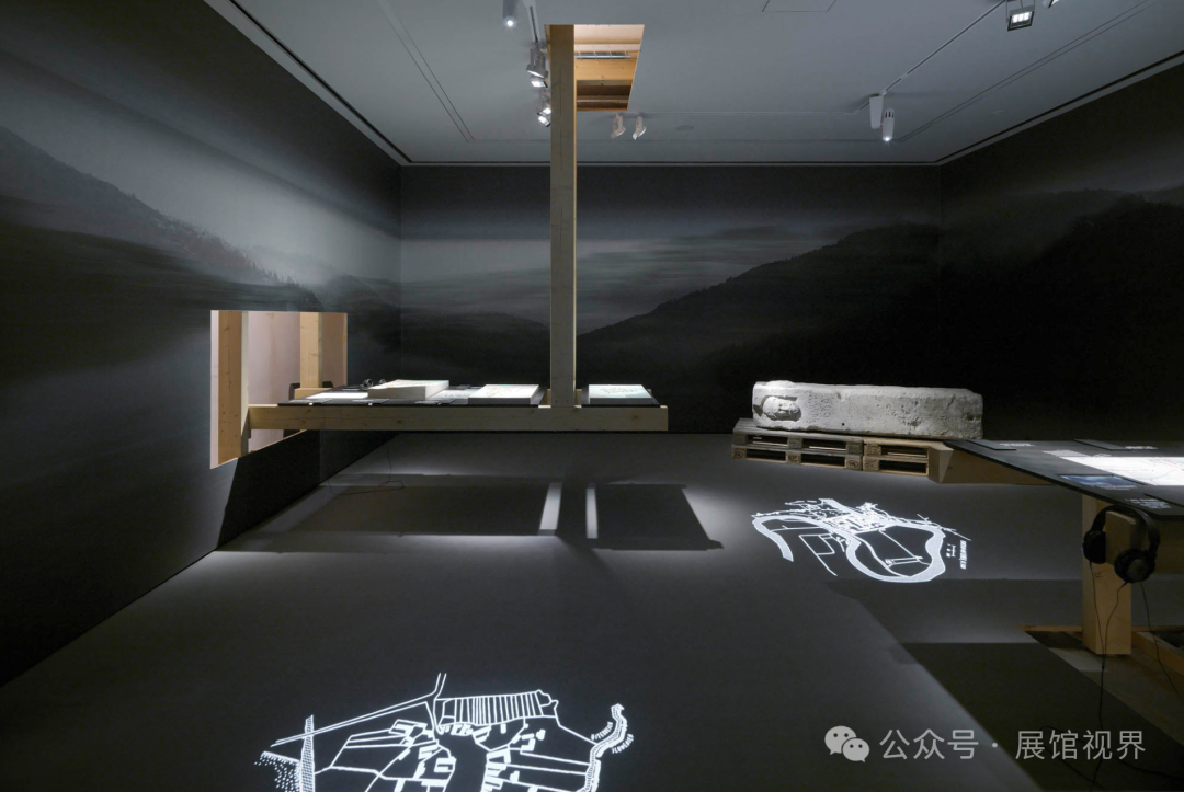 参观者在地板上大步走过,投射出城镇结构和类型,道路和路径的网络–成为它的一部分,沉浸在其中。大型展品,如罗马墓碑、枕头、精致的风琴碎片和军用帐篷,作为过去的浮渣和见证,在路边排列。