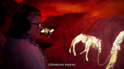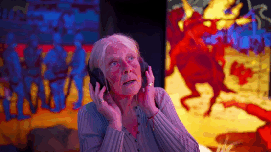 参观者戴着耳机进入博物馆,当进入房间时,故事开始播放......