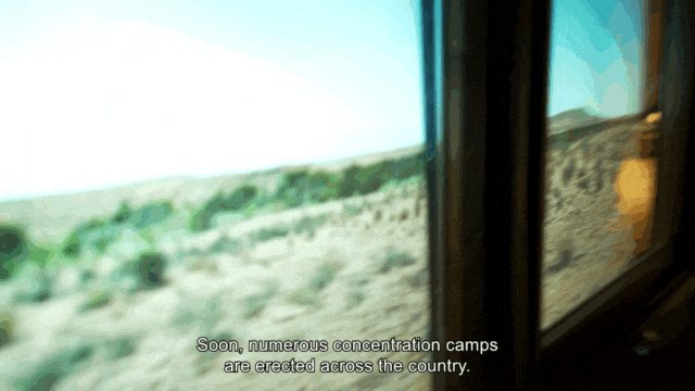 参观者坐在“火车”里,与艾米丽一同前往集中营。