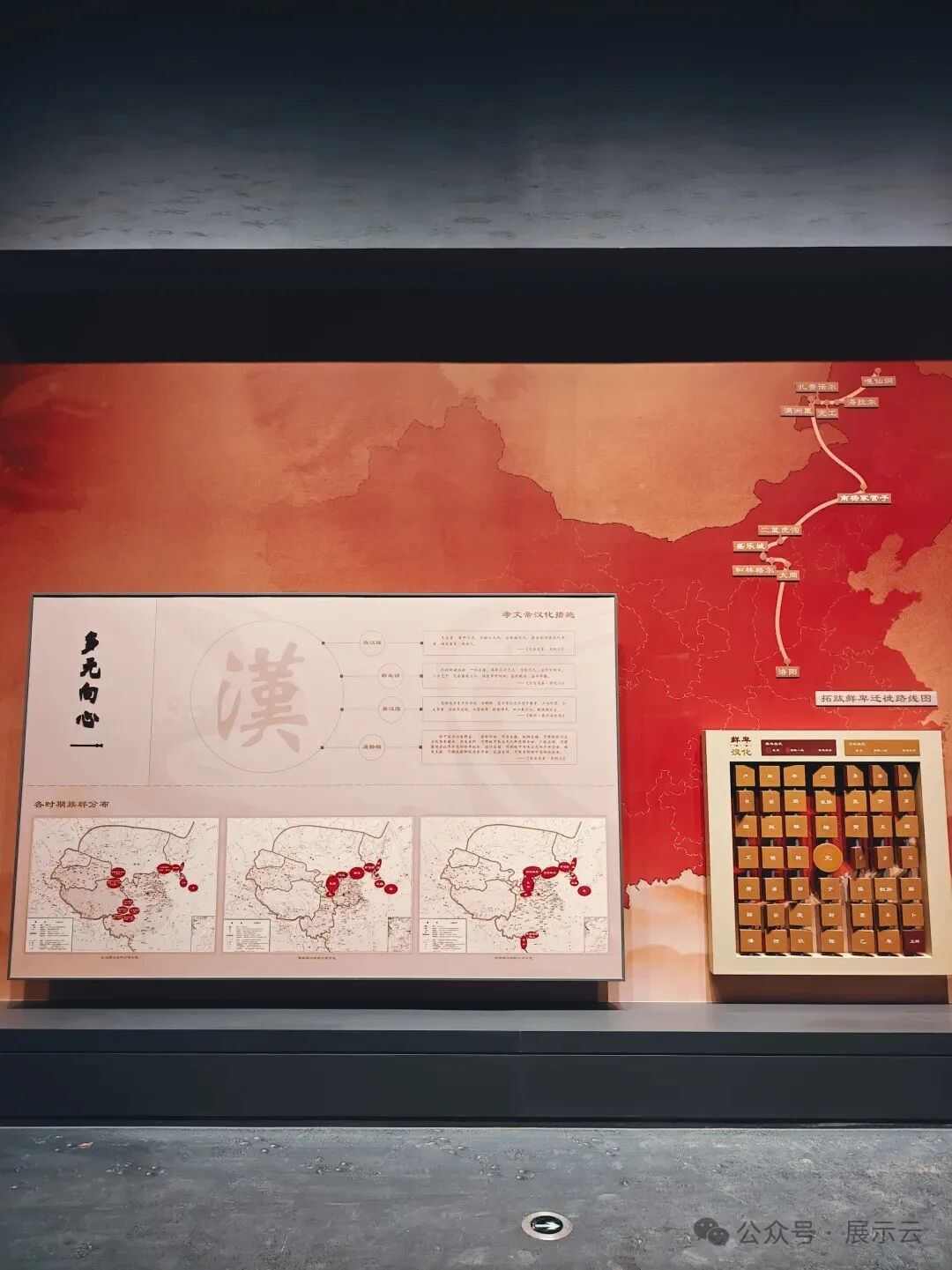 第二展厅展示汉魏故城所见证的古代民族大融合促使统一多民族国家的形成,以及成康之治、光武中兴、曹丕代汉、孝文帝改革等众多重大历史事件,折射出中华文化多元一体、中华民族融合包容的特性;